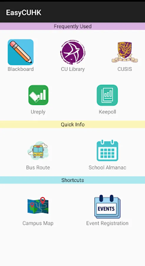 EasyCUHK includes Blackboard, CUSIS (MyCUHK), CU Library, Ureply, Keepoll, shuttle bus routes and etc. in one App!