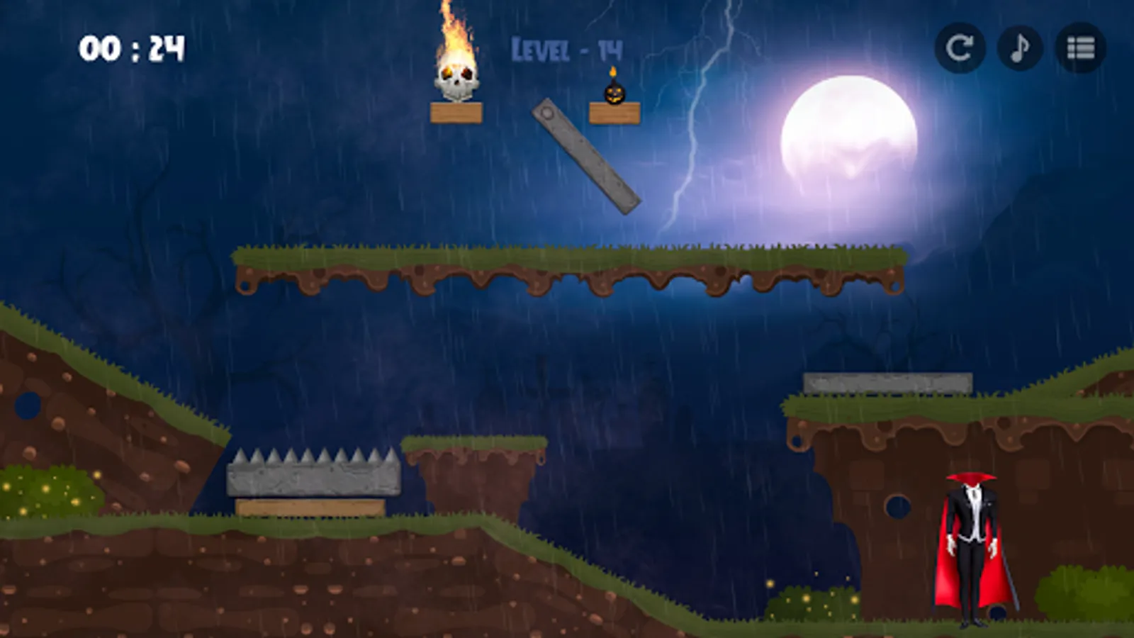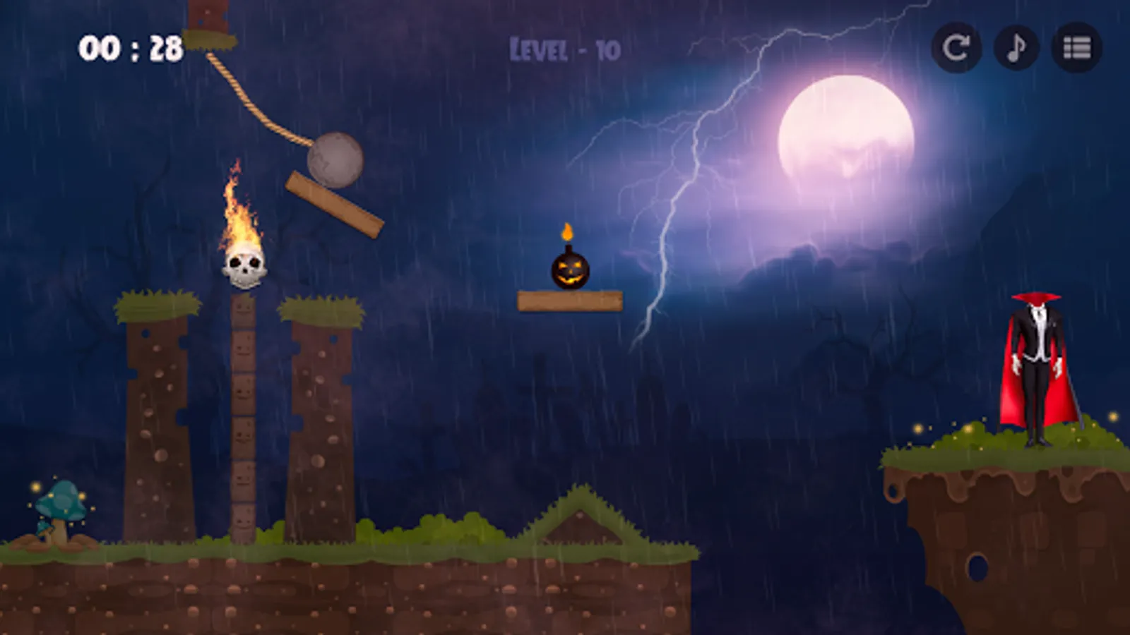 In the Haunted horror game, you will find vampire (evil figure) who lost his skeleton head and when you help him in fixing the head by rolling his skeleton head towards the body after crossing all the obstacles, the vampire would get conquer over death.