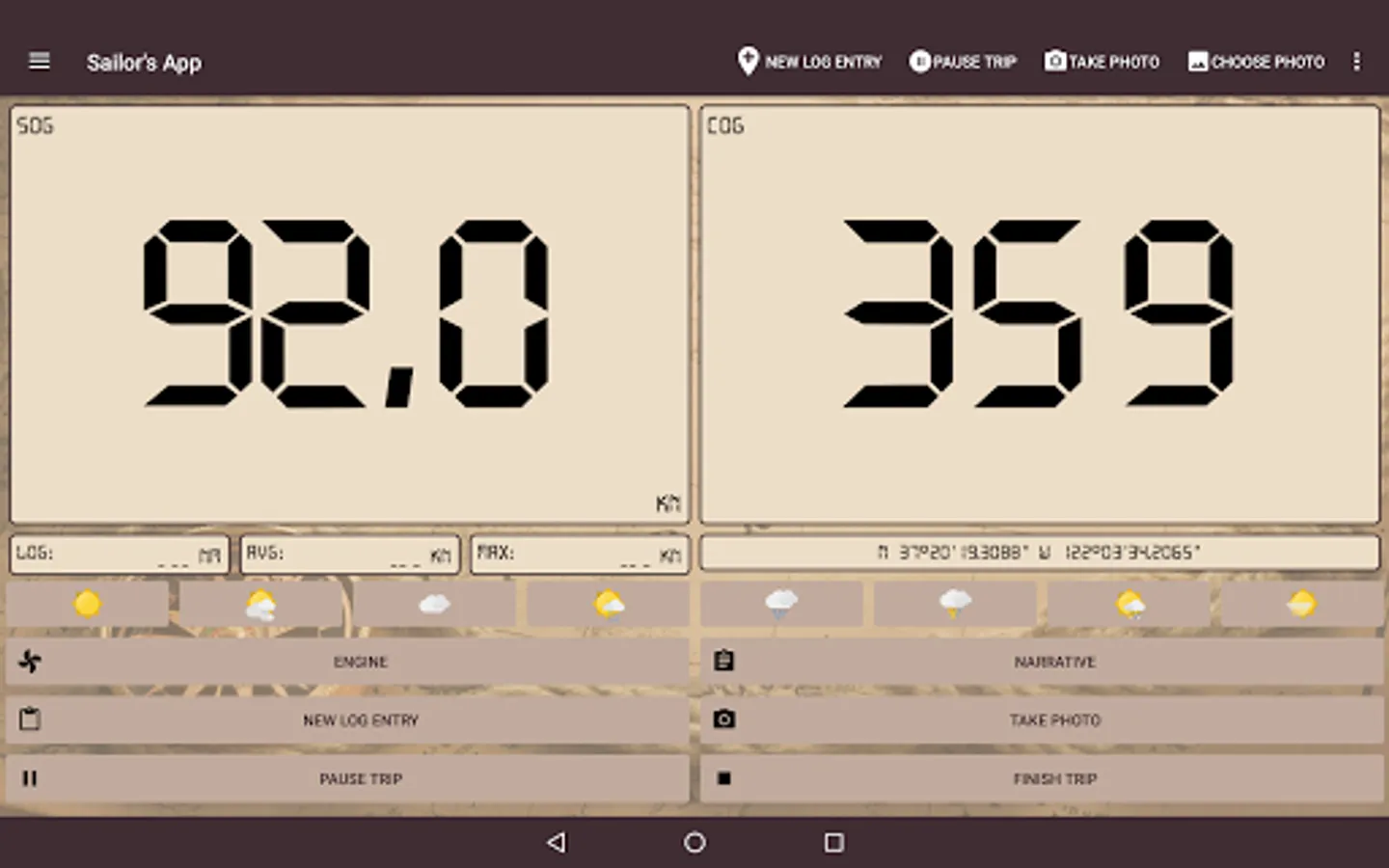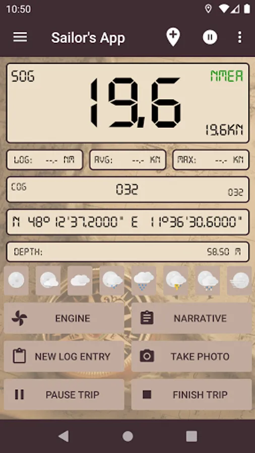 The device's sensors are used to fill the log (location, COG, SOG, temperature, pressure).