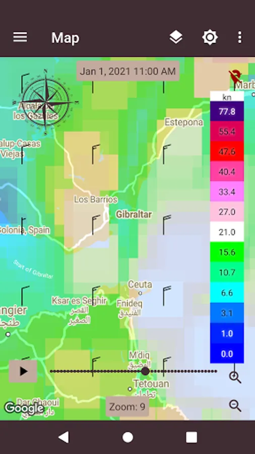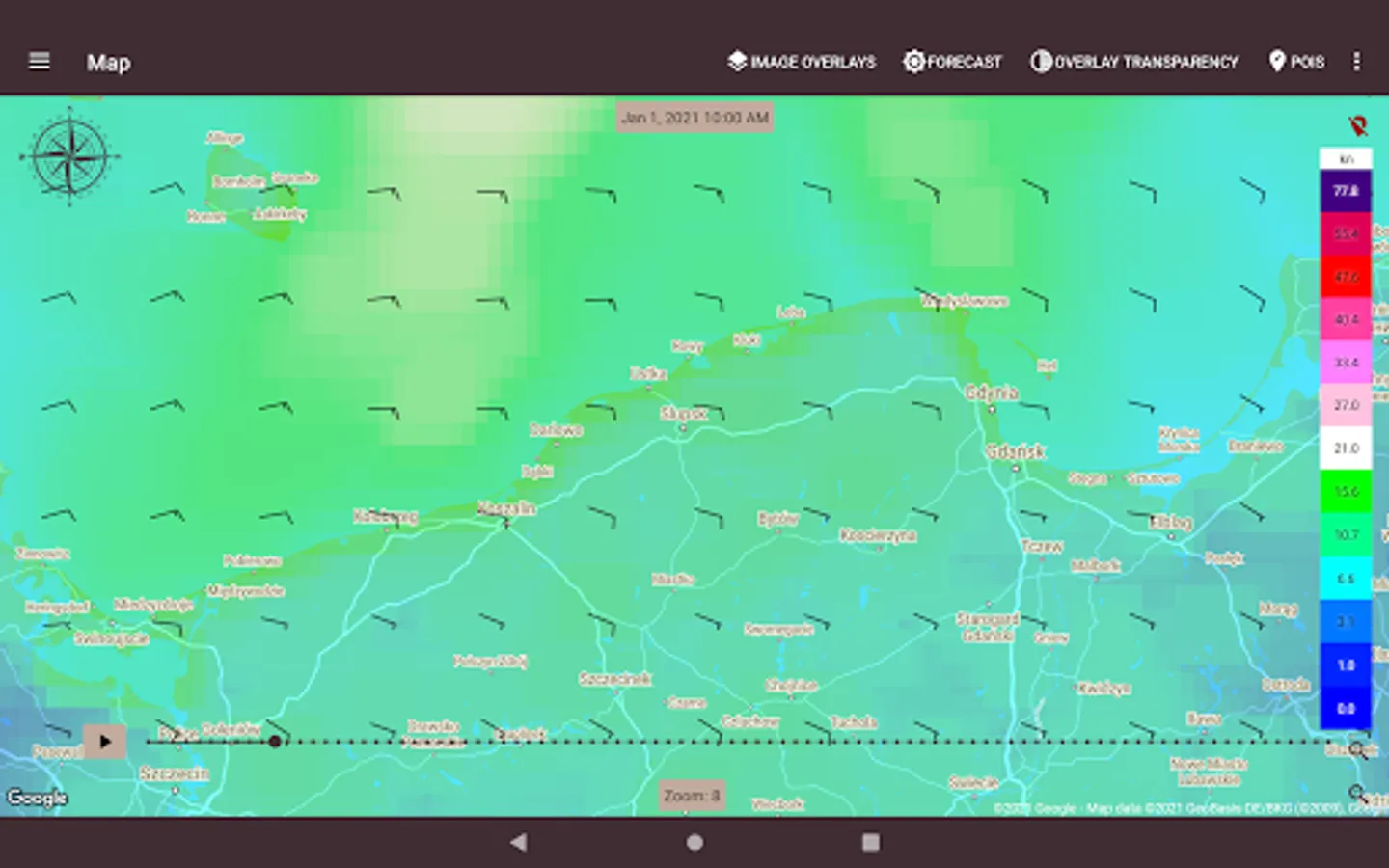 Global weather forecasts (NOMADS GFS, DWD ICON Global and selected locations) can be downloaded to the app and used during your trip.