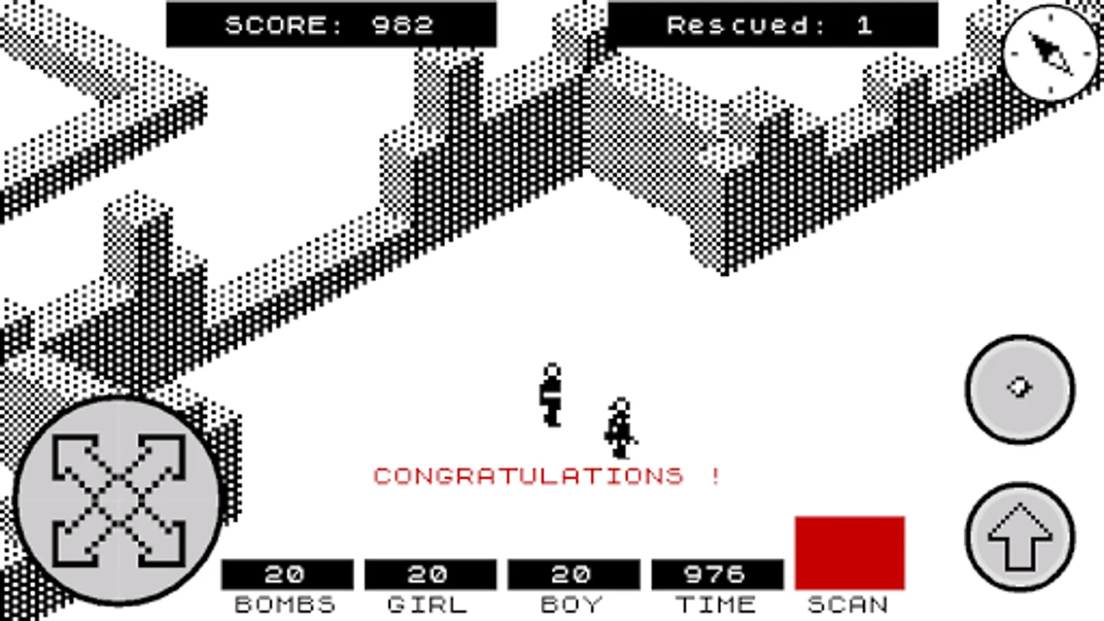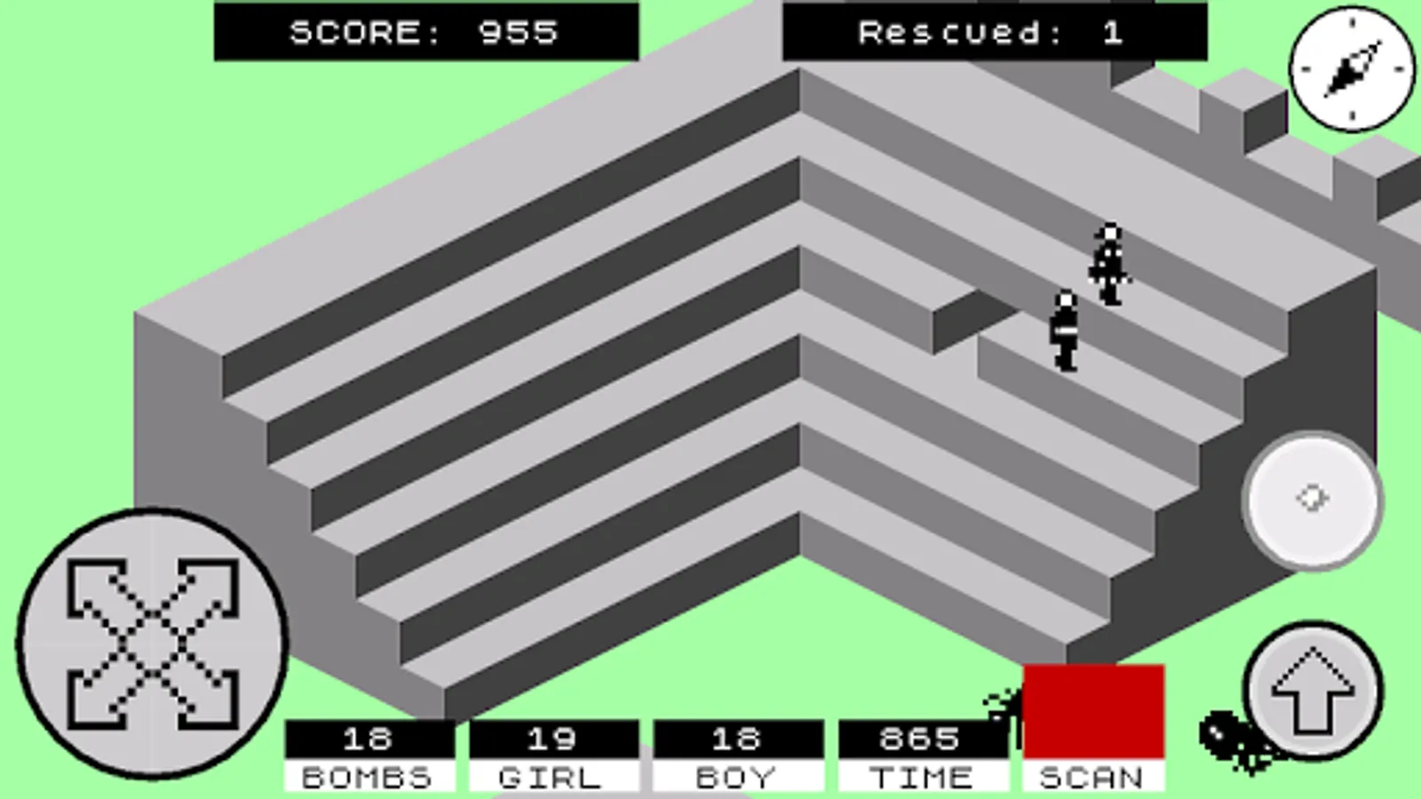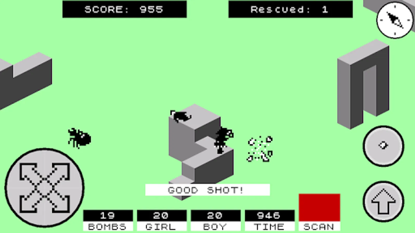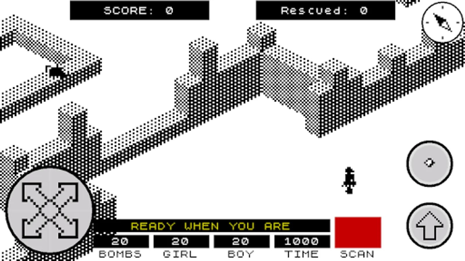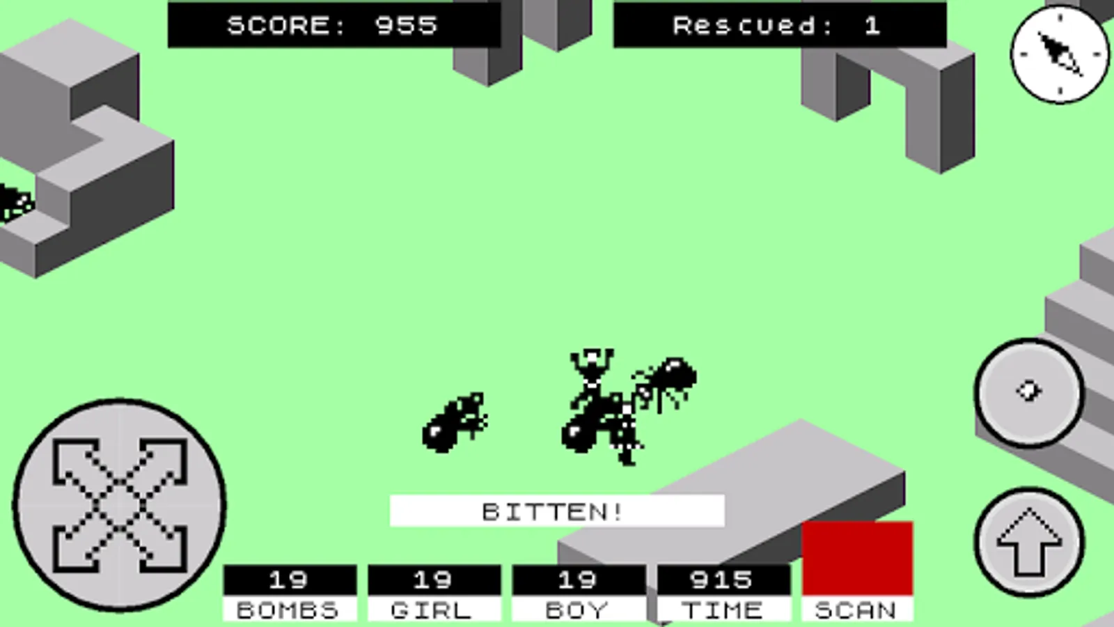 You are either a boy or a girl (the game allows to choose at the start) who has to enter the walled city of Antescher in order to rescue their significant other who has been captured and tied up somewhere in the city. The city is inhabited by giant ants which chase and attempt to bite you. You can defend yourselves by throwing grenades at the ants. Once the hostage is rescued, the two must escape the city. After this, try it again with the hostage located in a different part of the city, with each location being progressively more difficult to reach than the previous.