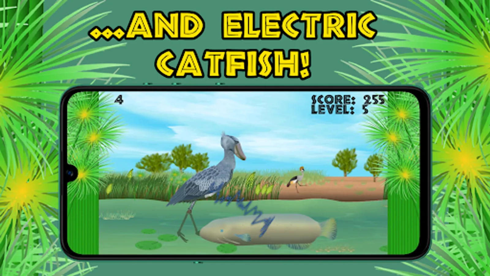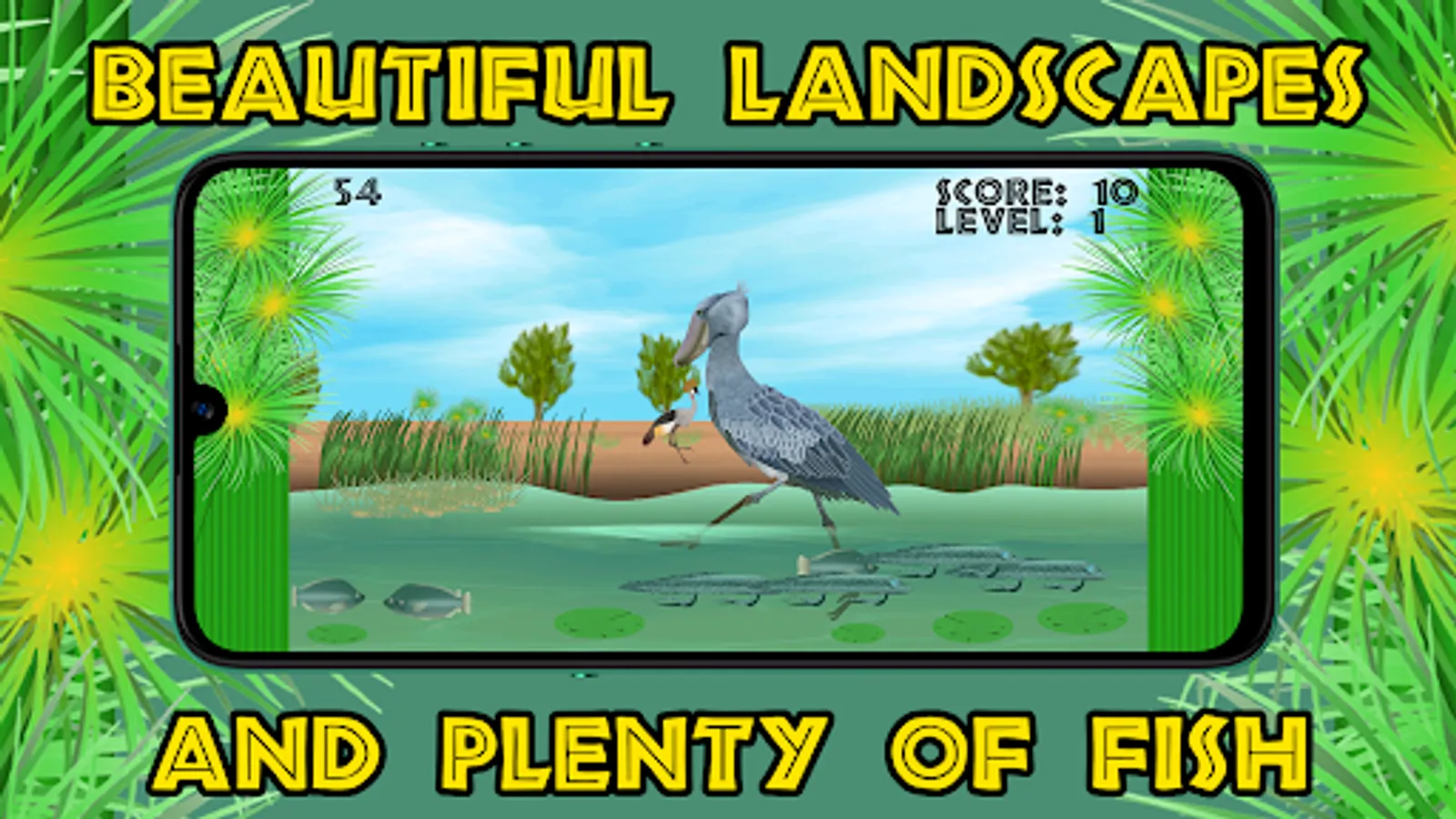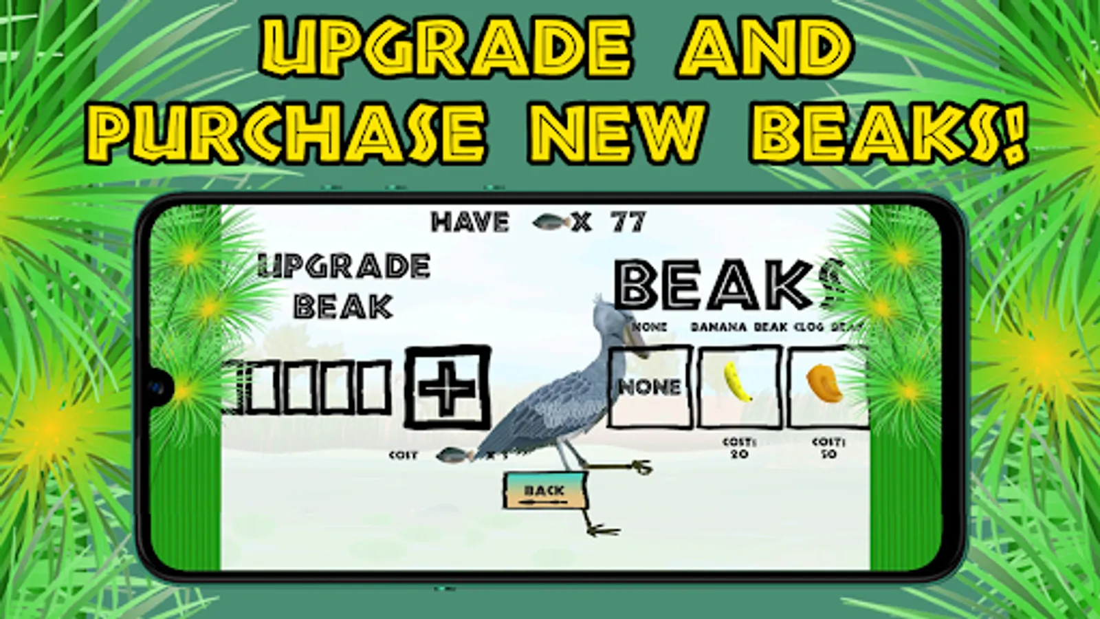 Control the shoebill by swiping left or right. Tap to eat the various animals in the swamps of Uganda. Fight off various large creatures that would take you crown as king of the swamp!