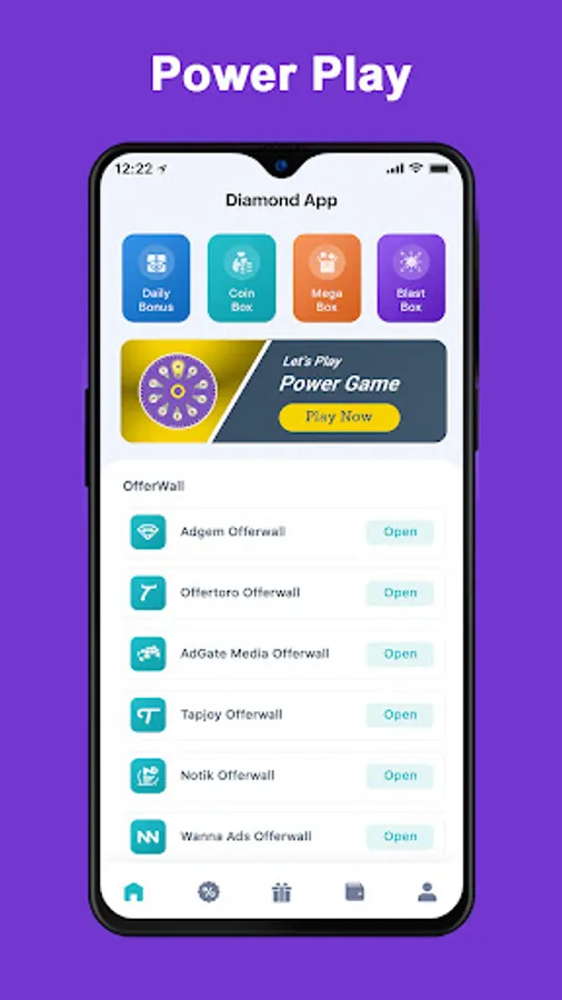 Power Play - Get Gift Card app have more feature to user work on simple task like offerwall, daily bonus, complete offer, survey, Mega Box, coin box, play Power Game