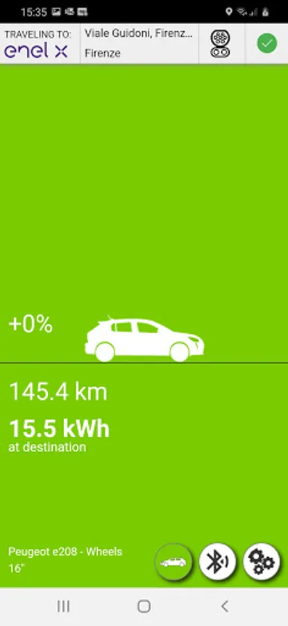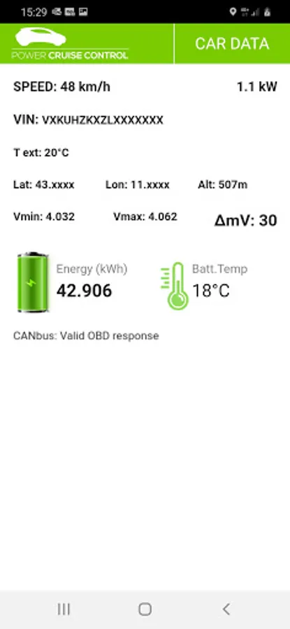 - is real-time connected to the car via a Bluetooth OBDII dongle and knows exactlythe SoC (State of Charge), the SoH (State of Health), the car's speed, instant power, and many other parameters;