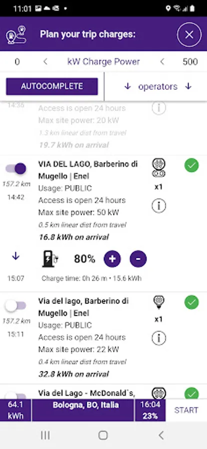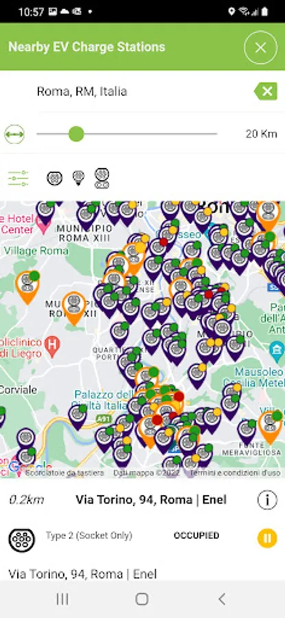 - indicates charging points nearby and along the route.