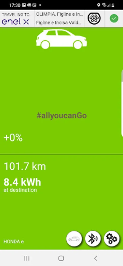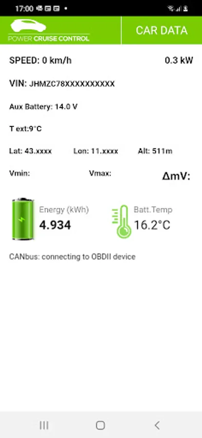 - is real-time connected to the car via a Bluetooth OBDII dongle and knows exactlythe SoC (State of Charge), the SoH (State of Health), the car's speed, instant power, and many other parameters;