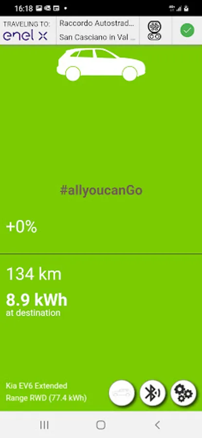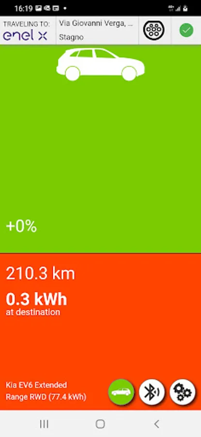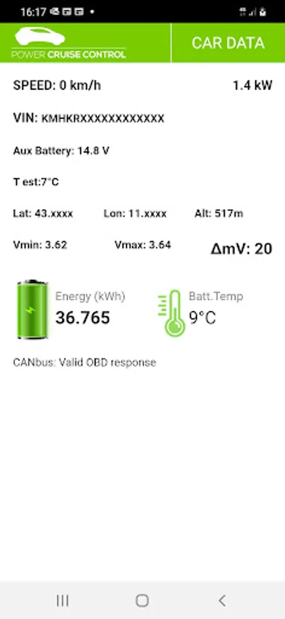 - is real-time connected to the car via a Bluetooth OBDII dongle and knows exactlythe SoC (State of Charge), the SoH (State of Health), the car's speed, instant power, and many other parameters;