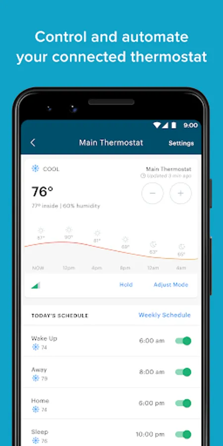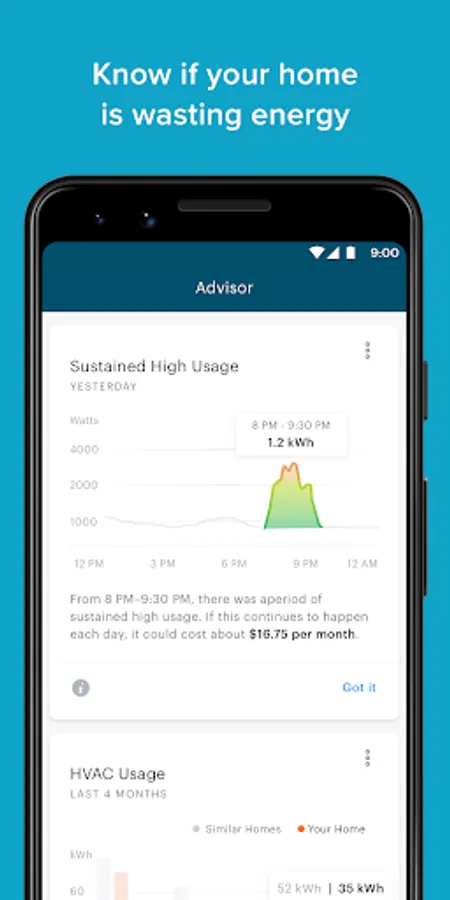 • Receive energy breakdown analytics to see how much electricity you’re using for heating, cooling and other appliances and systems in your home