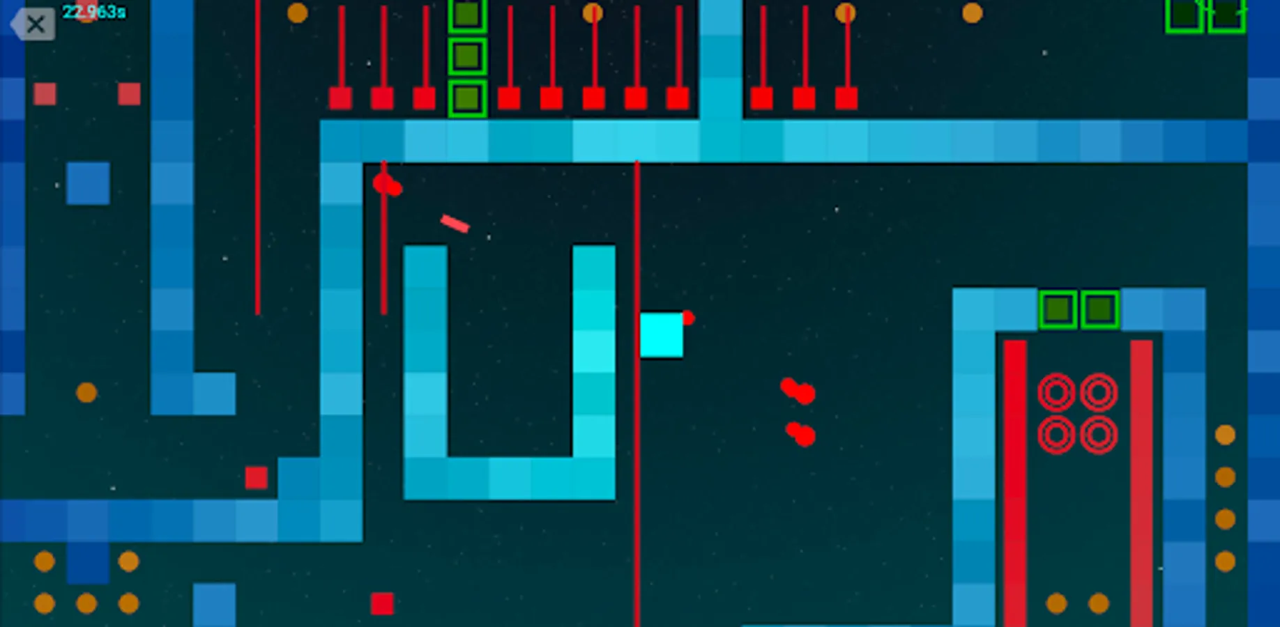You are the Brick. The objective of this game is to move through progressively more complex levels to the green bricks without getting hit by the red enemies and obstacles: Lasers, Projectiles, Missiles, Turrets, RED WALLS, Time Bombs, Vortexes, Bouncers, and more!