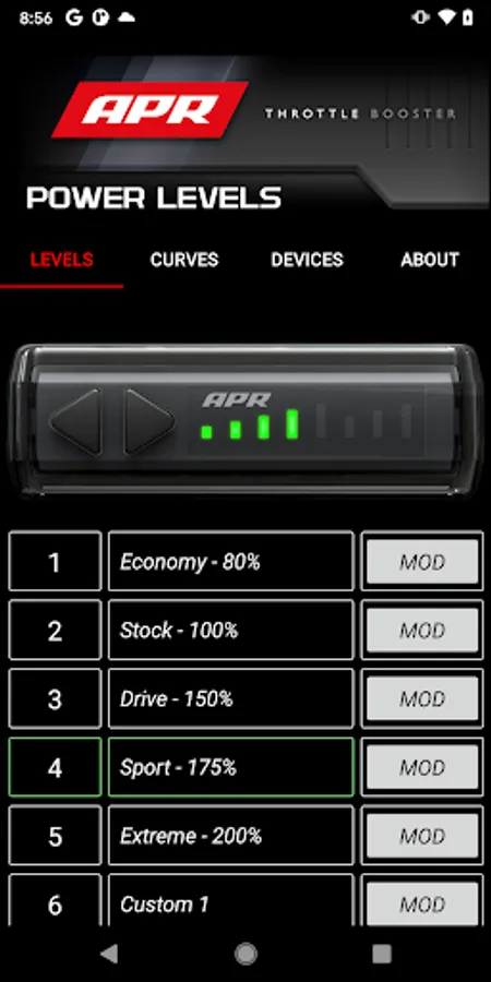 This all works via Bluetooth to the APR Throttle Booster Module. It plugs into your factory throttle harness and then communicates wirelessly with the app and the included wireless switch, giving you multiple methods to quickly change profiles. With most vehicles on the market today offering such an undesirable throttle pedal response profile, you’ll love having the ability to adjust it on your own. And don’t worry, our intuitive guides and tutorials make adjustments a breeze!