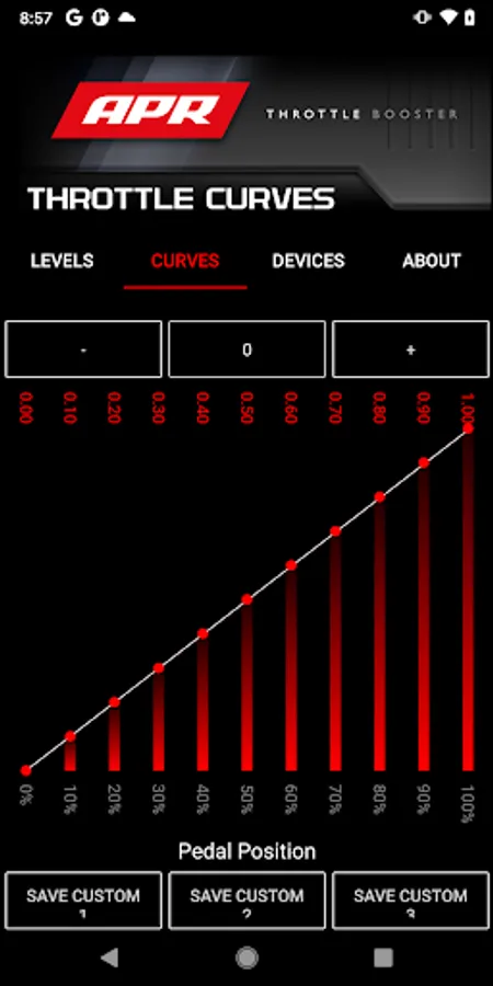 The APR Throttle Booster app allows you to wirelessly tune your vehicle’s throttle pedal for an instant response and finely tuned sensitivity to your desire. The app comes pre-loaded with 5 preset throttle response curves. Optionally you can tune the profile on your own. Go soft or lightning-fast – it’s your choice!