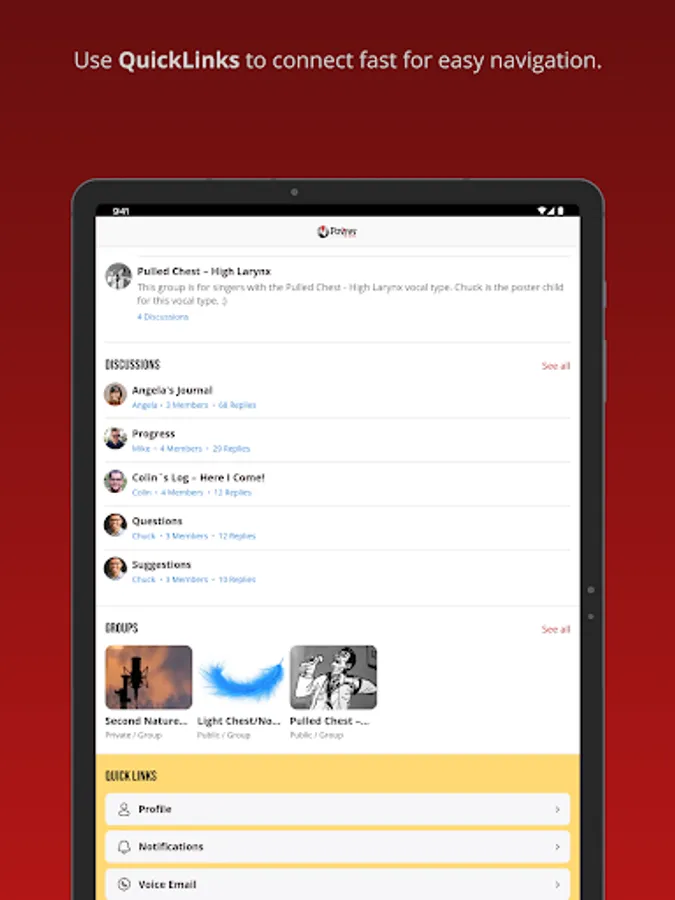 In addition to courses, there are hundreds of singers who are members of Power To Sing. When you join the free course you get access to groups and forums to help you succeed with your singing.