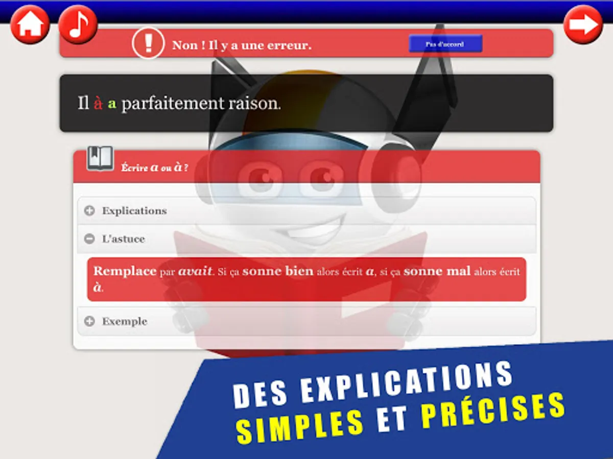 Operating in a sound and graphics dramatized atmosphere and inspired video games, children are at each level facing short sentences or fault. If it identifies a fault, it indicates this by clicking on the word. A small robot anime and comments pictorially successes and mistakes. If he is wrong a simple and precise explanation is given. The proposed rules are deliberately pragmatic, often based on the principle of substitution by an equivalent term to resolve ambiguities between the same words ("to" or "a"?) And thus give your child simple tools to highlight the meaning and grammatical function words.