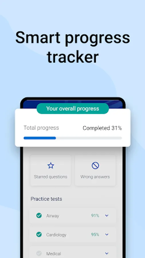 There is overall progress on the main screen of the application. Thus, you can instantly follow how prepared you are for the exam.
