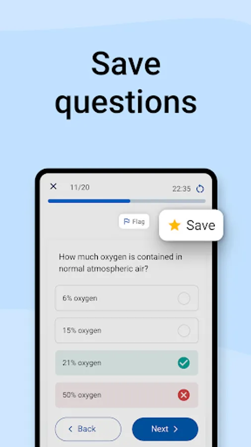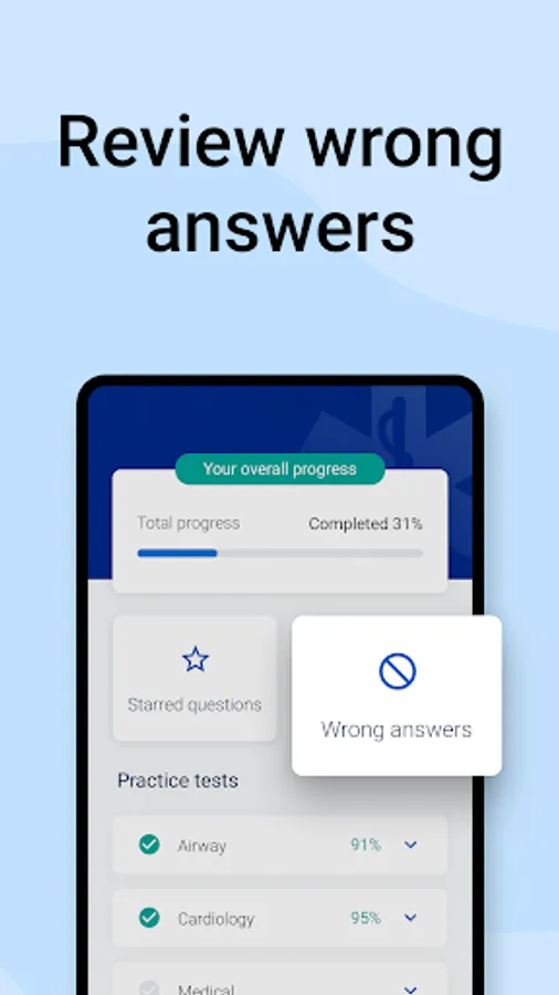 In the next section, you can find the starred questions and wrong answers menus. By starring certain questions during tests, you prepare for them later. You can find your wrong answers in a single menu and study them separately.