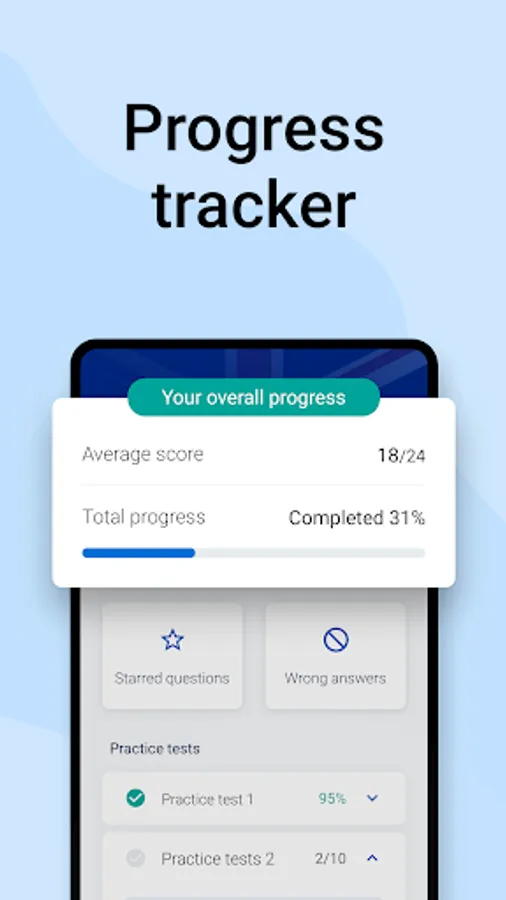 There is overall progress on the main screen of the application. Thus, you can instantly follow how prepared you are for the exam.