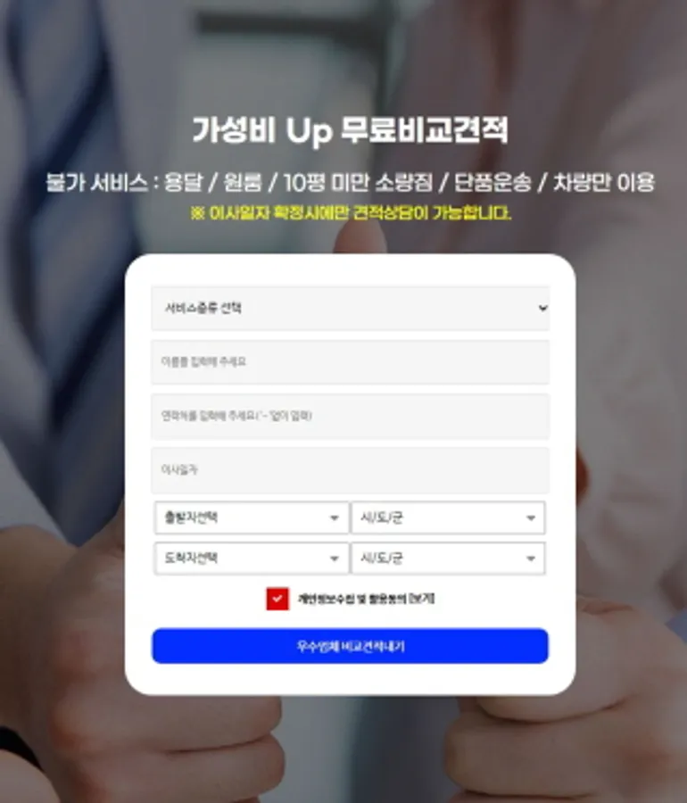 There is no need to contact and find out about several companies, and without worrying about it, I am sure that you will reduce time, cost, and hassle, and your satisfaction will be doubled with only an estimate from two excellent points in our moving room of Seo Kyung-seok. In addition, for each affiliate store, prices and services vary slightly depending on the team, number of people and equipment, and the number of moving cases on the moving day. You can get two quotes and choose the one you like the price and service.