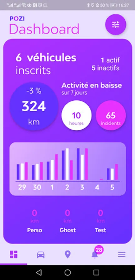 POZI analyzes movements in real time and shows you the evolution of the activity of your vehicles. You have reliable information on the performance of all your connected vehicles at all times. The use of your vehicle has no more secrets for you thanks to the information that POZI allows you to view: mileage, trips, incidents, positions, etc.