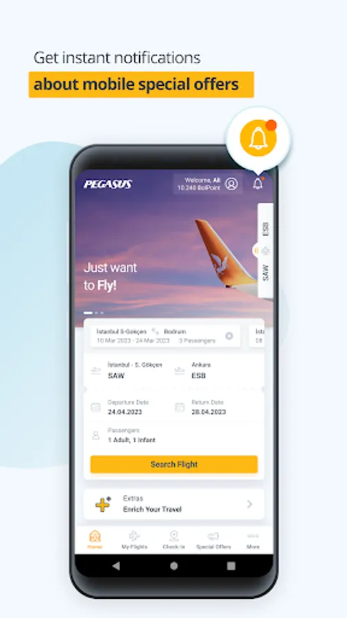 Flight ticket booking app designed for Pegasus passengers keep an easy travel motto. Book a flight and pay for your airline tickets after several browses and clicks. Reserve flights from one of Eco, Super Eco, Advantage and Business Flex travel packages on the app.