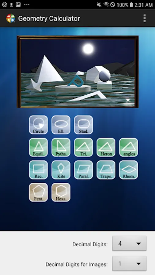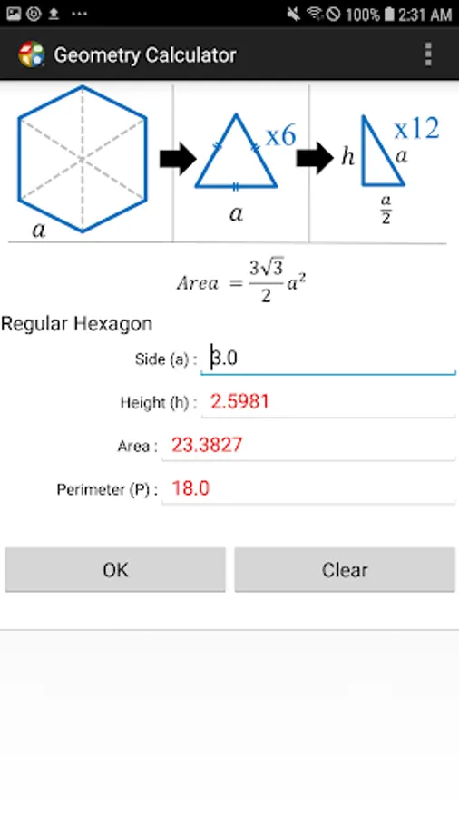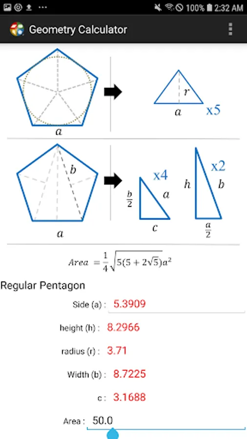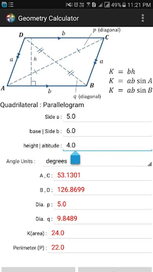 With this app, you can obtain the remaining parameters of geometry shapes based on your given input. An image of a shape will also be illustrated based on your input.