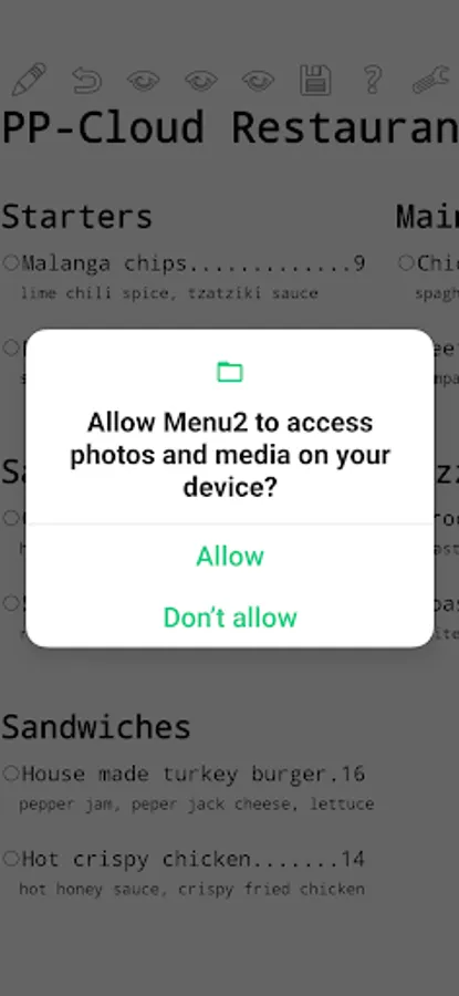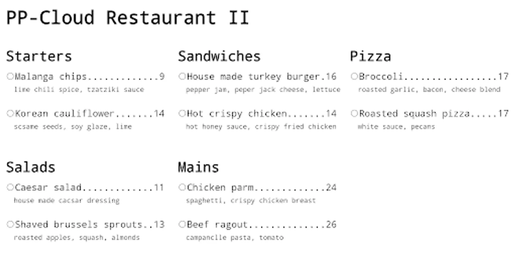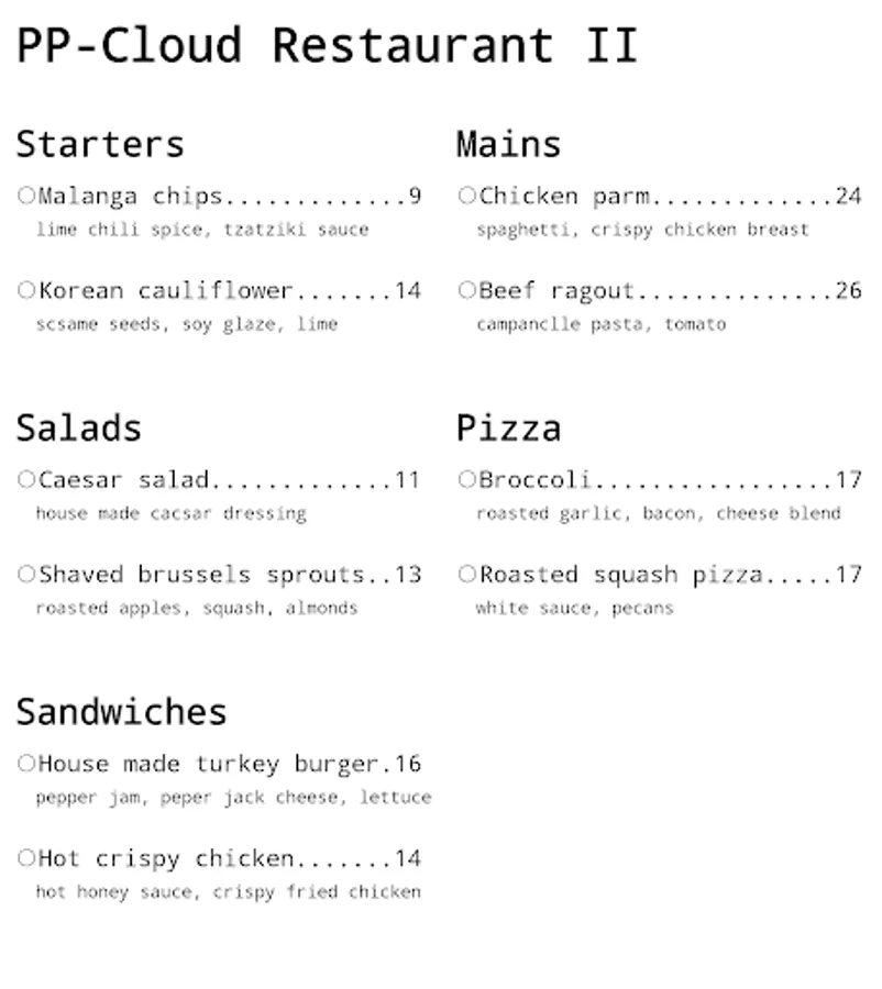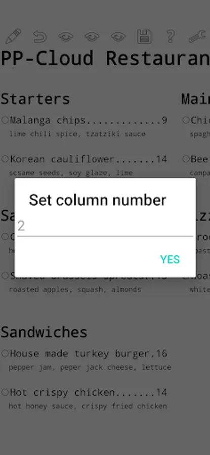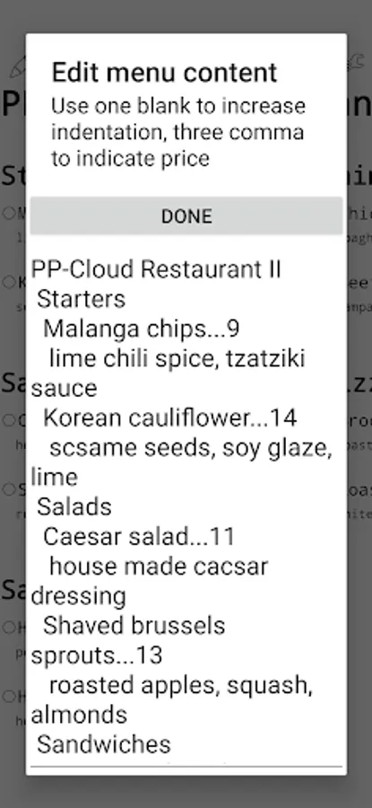 Edit: Edit the menu content (use one blank to increase the indentation, three comma to indicate price)