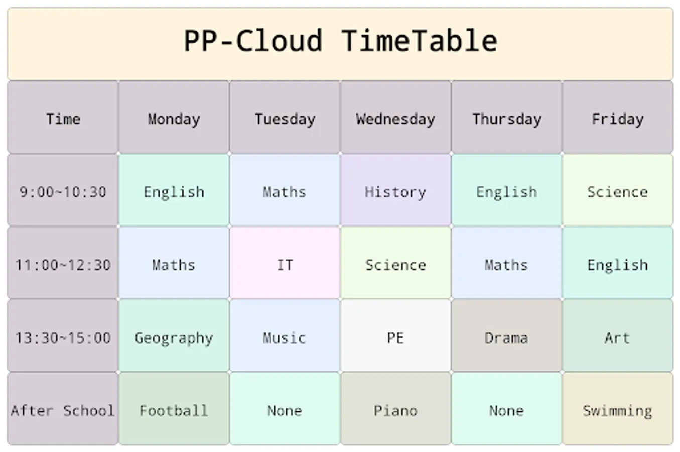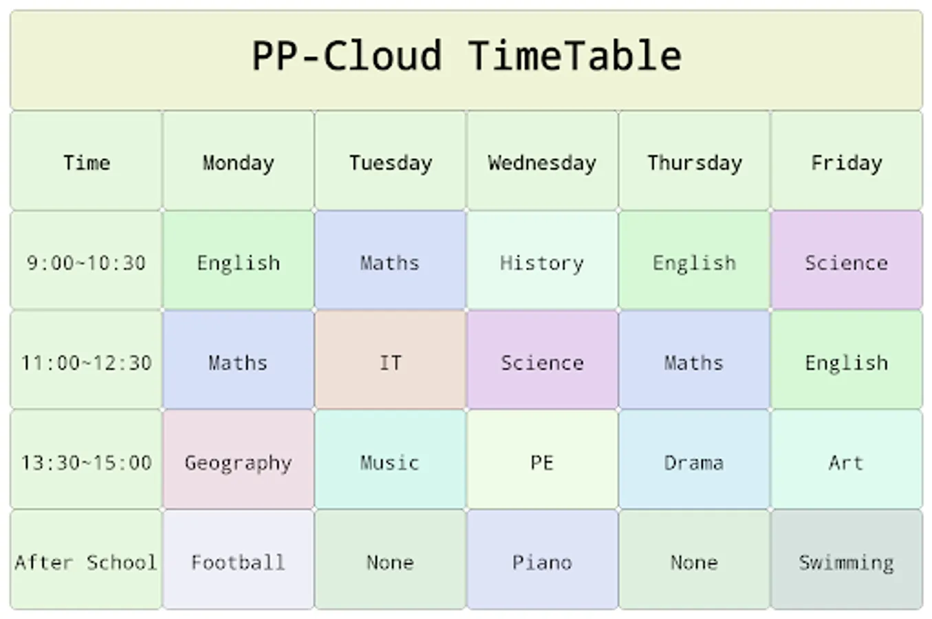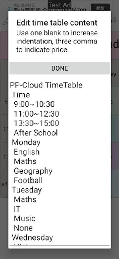 Edit: Edit the time table content (use one blank to increase the indentation)