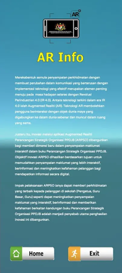 Merekabentuk semula penyampaian perkhidmatan dengan membuat perubahan dalam komunikasi yang berterusan dengan implementasi teknologi yang efektif merupakan elemen penting menuju pada masa hadapan selaras dengan Revolusi Perindustrian 4.0 (IR 4.0). Antara teknologi terkini dalam era IR 4.0 ialah Augmented Realiti (AR). Teknologi AR membolehkan pengguna berinteraksi dengan objek dunia maya yang digabungkan ke dalam dunia sebenar dan muncul dalam ruang yang sama. Justeru itu, inovasi melalui aplikasi