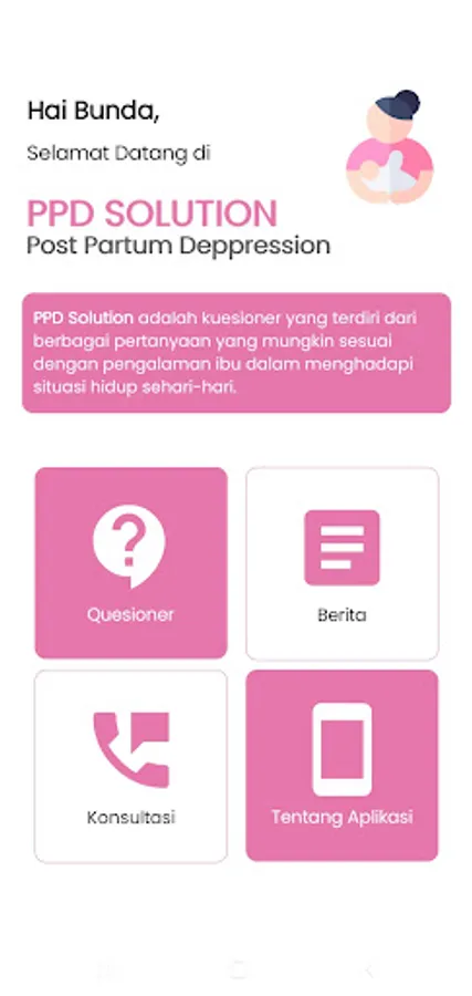 PPD Solution adalah aplikasi yang bertujuan untuk mendeteksi tingkat kecemasan yg terjadi pada ibu nifas. Aplikasi ini juga memuat beberapa pengetahuan terkait dengan post partum blues sampai dengan depresi post partum.Aplikasi ini berupa kuesioner yang terdiri dari berbagai pertanyaan yang mungkin sesuai dengan pengalaman ibu dalam menghadapi situasi hidup sehari-hari.