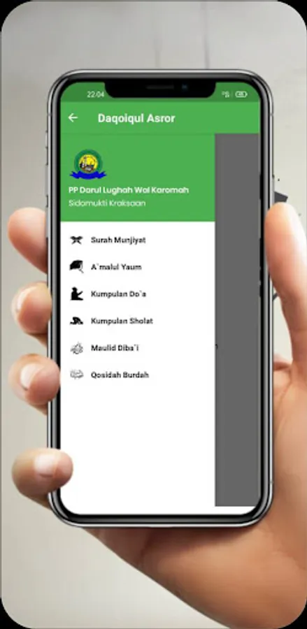 This application contains Surah Munjiyat, A`malul Yaum, Prayer Collections, Prayer Collections, Maulid Diba`i and Qosidah Burdah which are commonly used by PP Darul Lughah wal Karomah students.