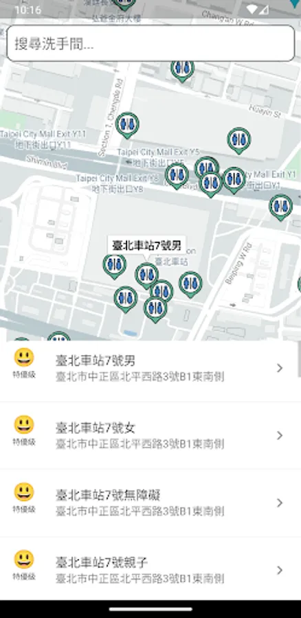 3. Keyword search: You can use the keyword search function to quickly find restrooms that meet specific needs or locations, such as "Taipei Main Station", "Barrier-free"...etc.