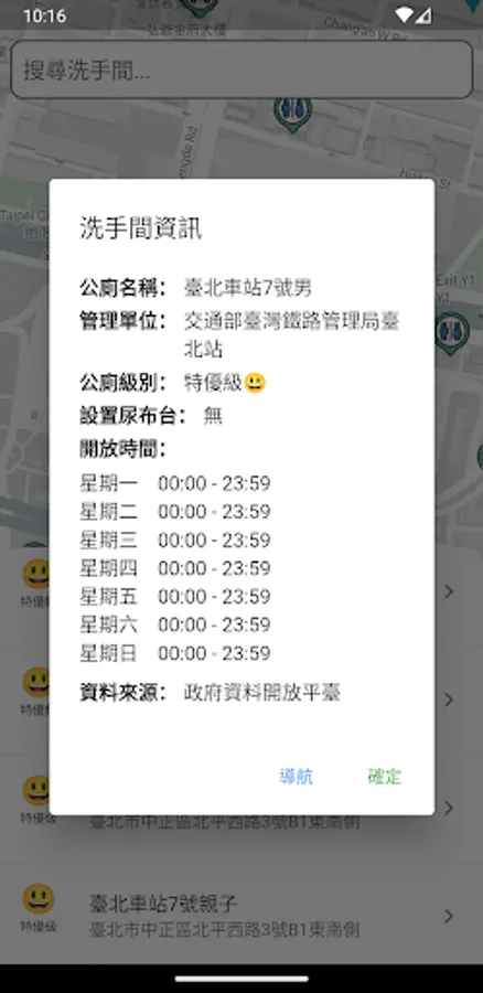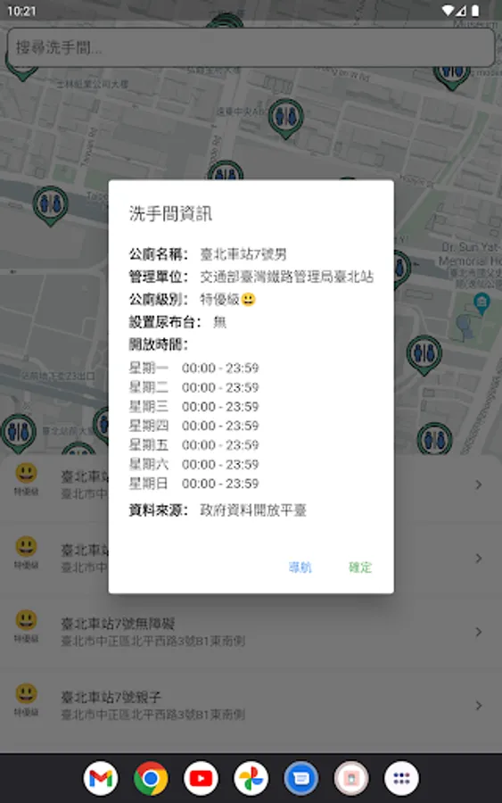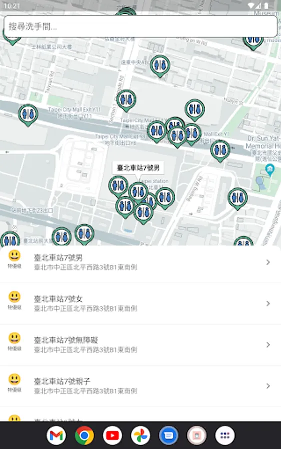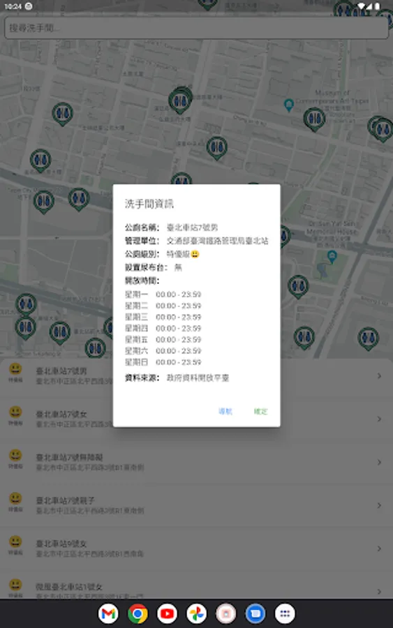 1. Toilet information in Taiwan: Our database covers public toilets in Taiwan, including shopping malls, parks, gas stations, MRT stations, etc., so that you can find toilets anytime, anywhere.
