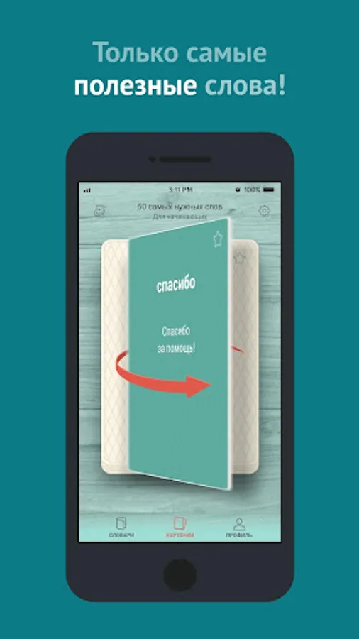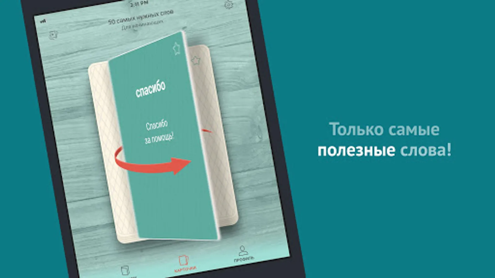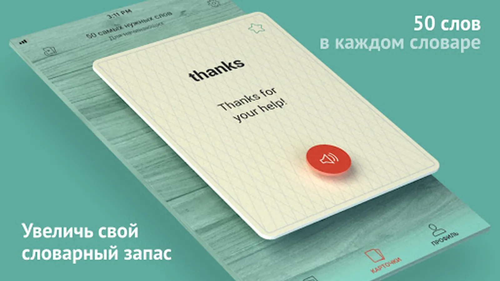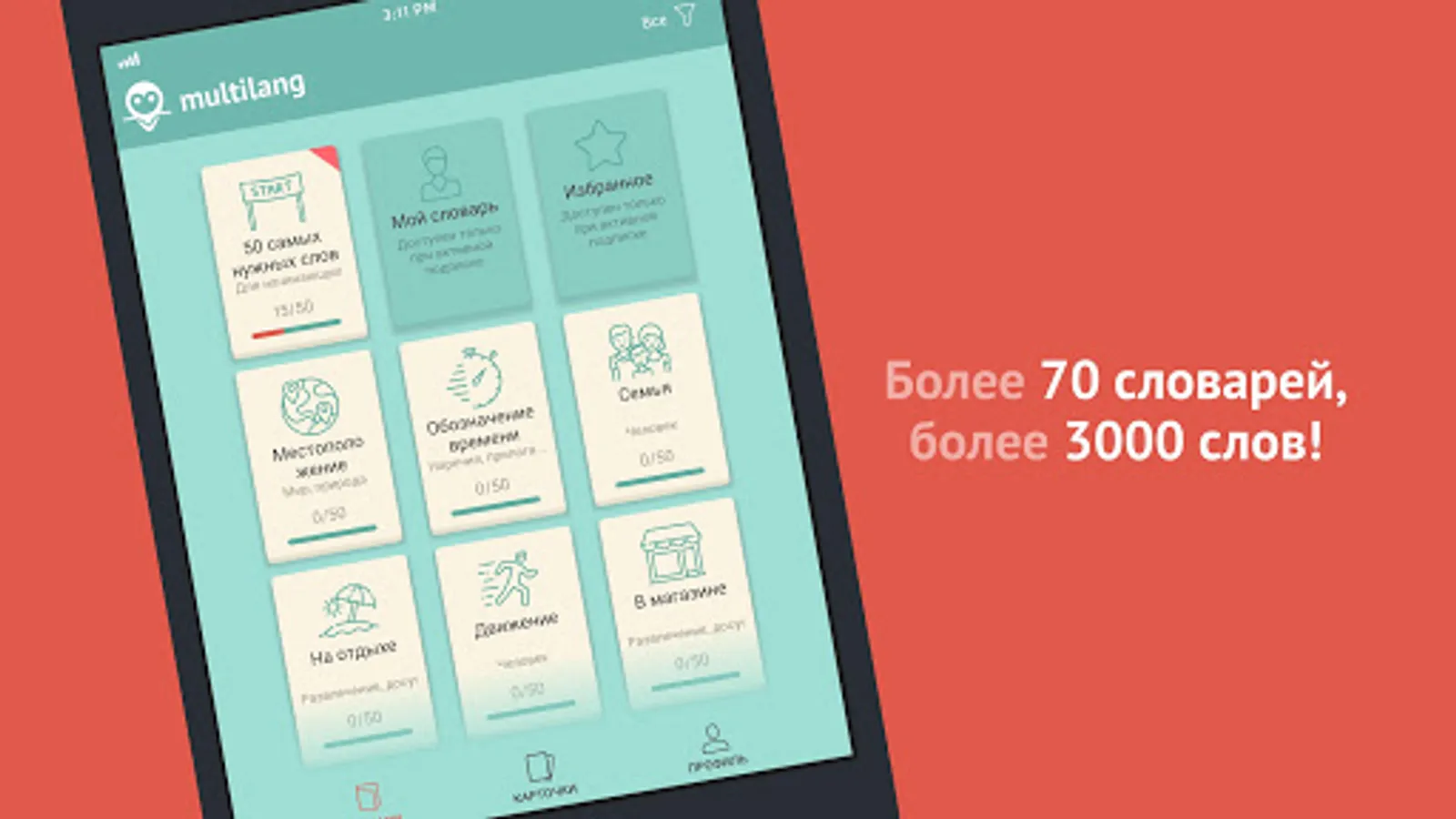 Multilang - it's like paper flashcards with words and translation in your phone. On the flashcards there is a word, a sentence with an example where the word is applied and audible pronunciation. To find out the translation of a word and a sentence, just flip the card, it's that simple!