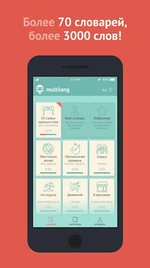 An extensive library of dictionaries sorted by topics and difficulty levels is suitable for both beginners and experienced users.