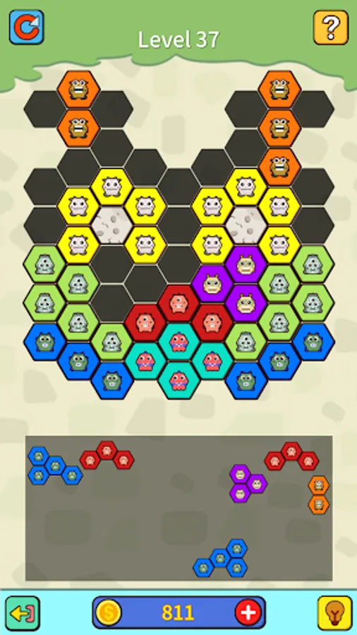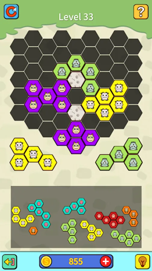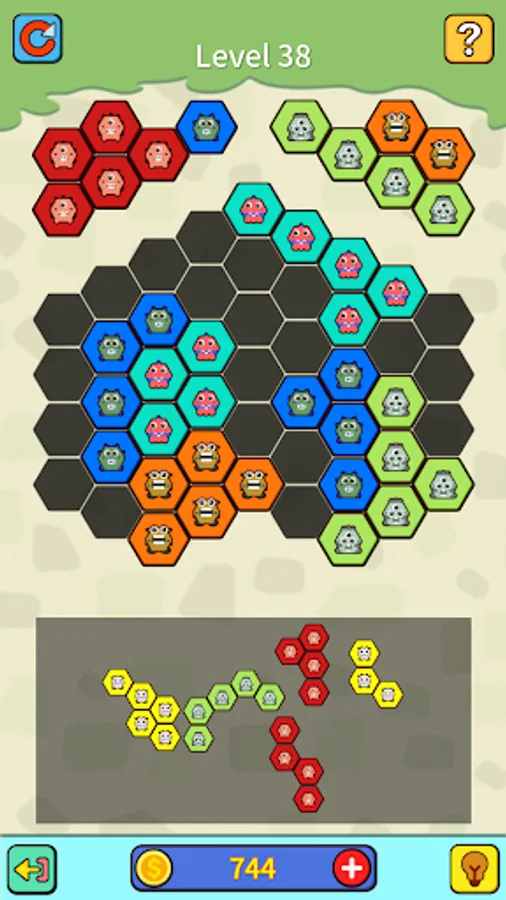 In this game, you have to drag and drop the hexagonal blocks at the bottom to fill up the big hexagonal grid at the top. Sounds easy, right? But be careful, you have to use all the blocks and fit them perfectly, or you will lose the game.