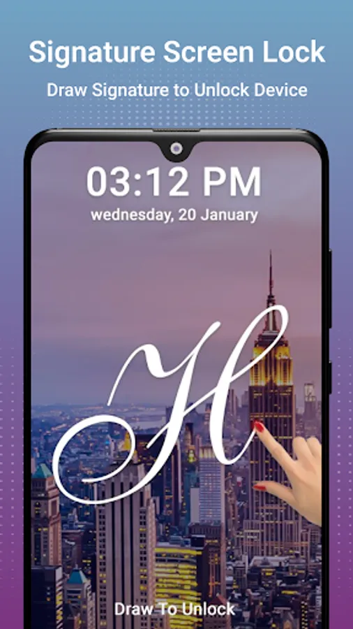 Draw letters, draw numbers, draw shapes, draw signatures and draw contextual Signature to unlock. Signature Lock Screen application has feature of creating new Signature, change color of Signature, change background theme of Signature and also new Signature can be created if you want to change the old Signature.