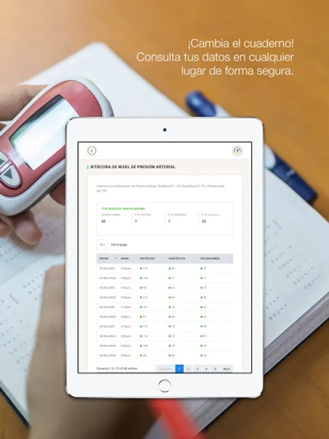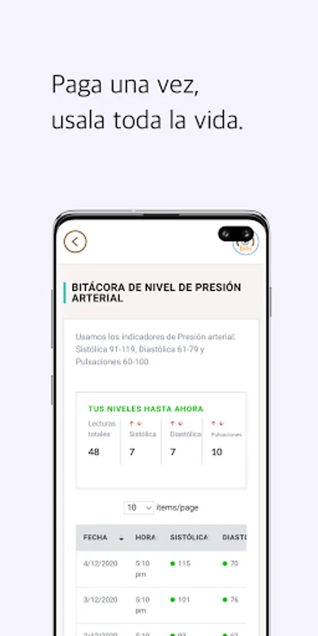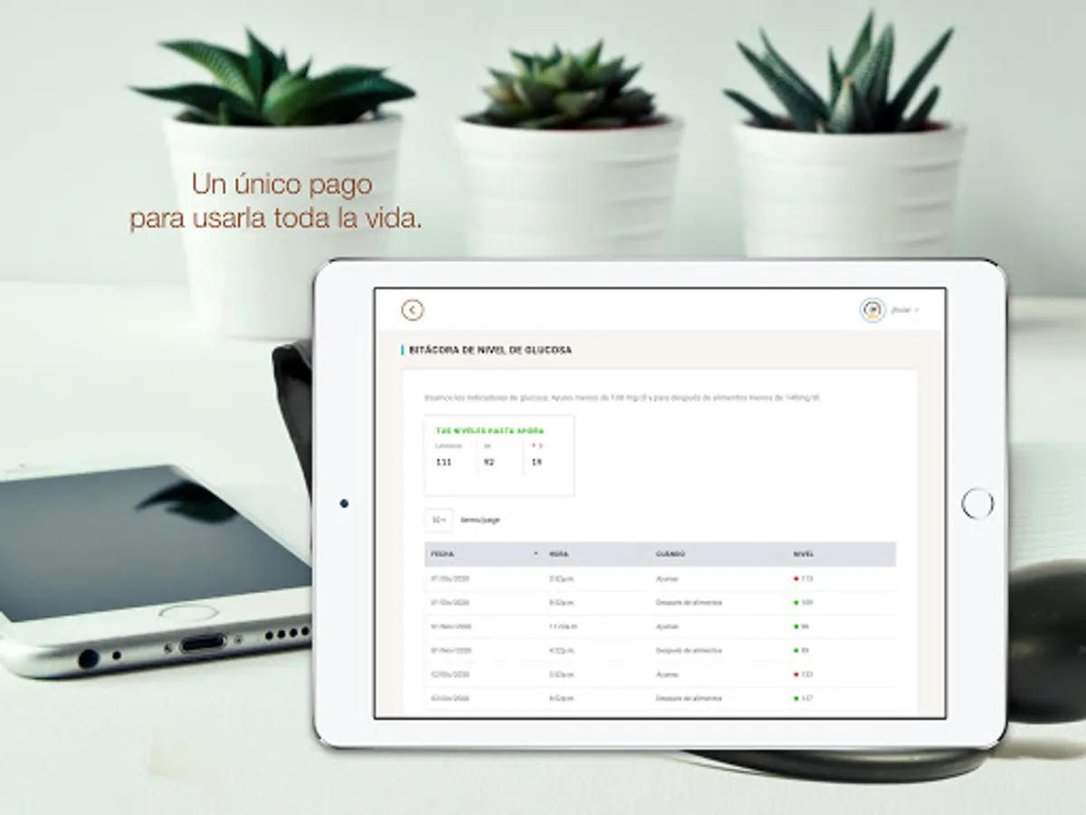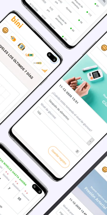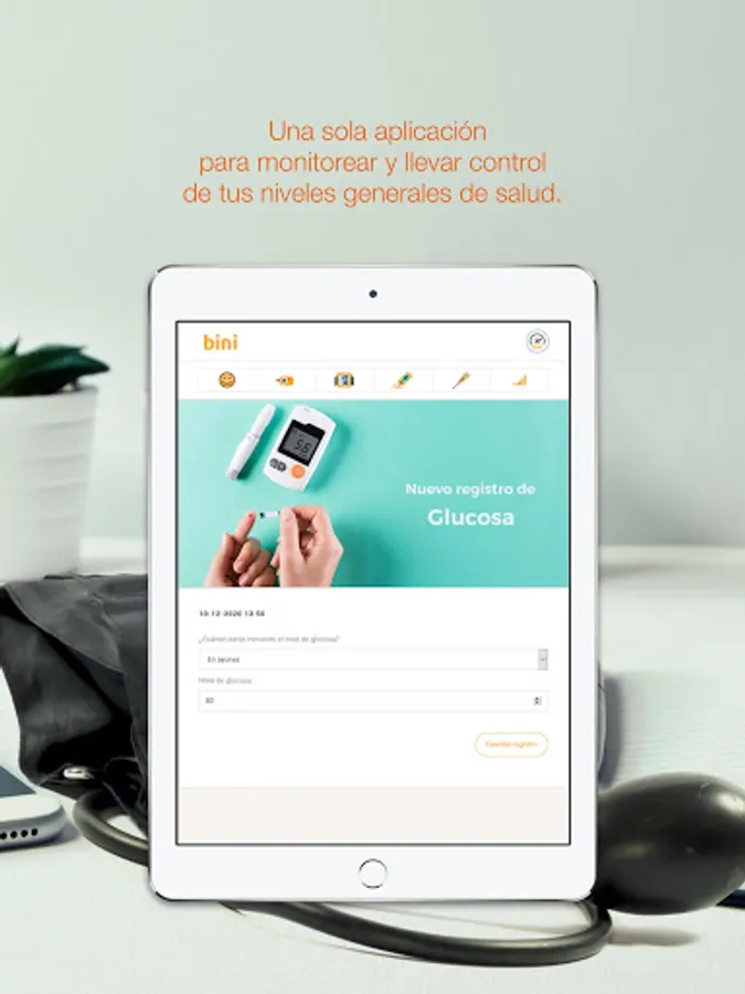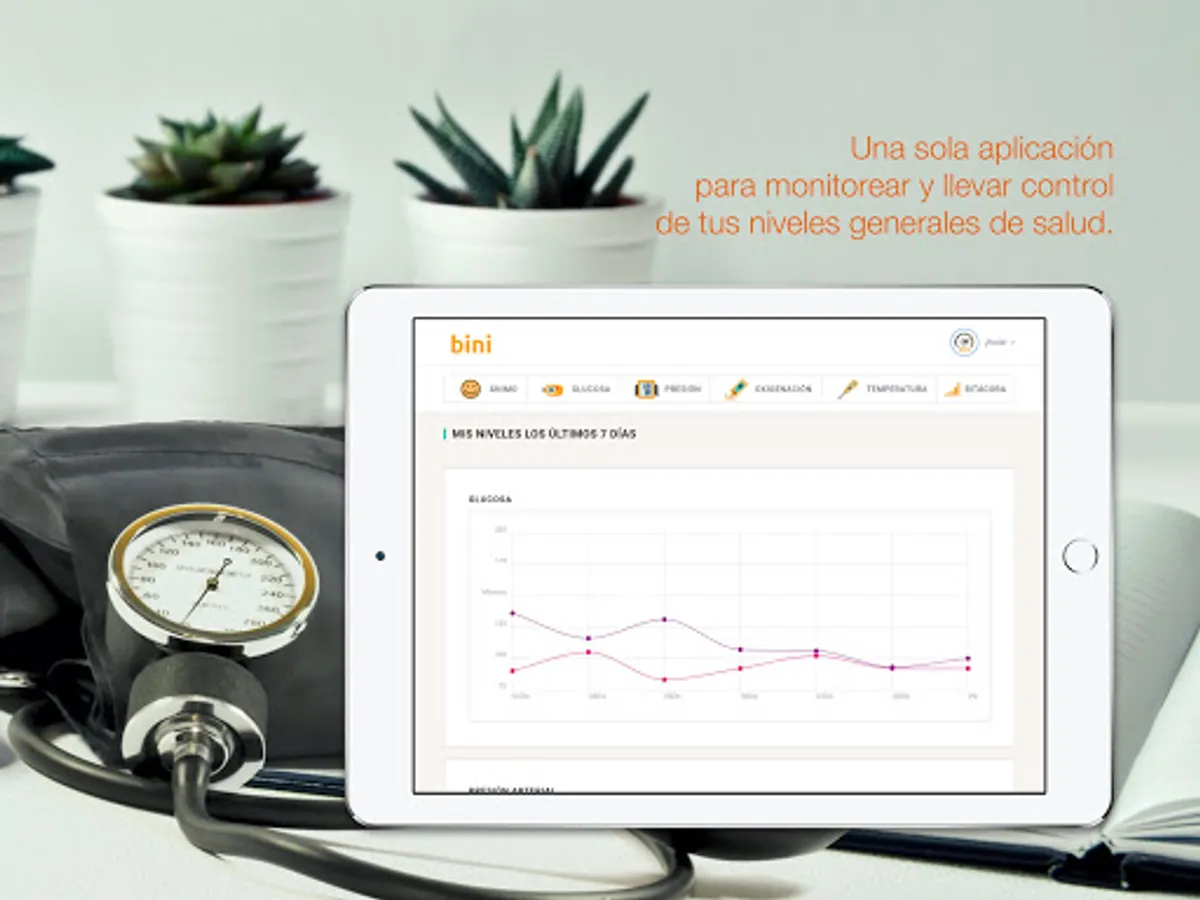 BINI is a log of your general health levels. You can store your glucose levels, blood pressure, oxygenation, temperature and mood on a daily basis. You will be able to consult the data in a table so that you can better monitor your health.