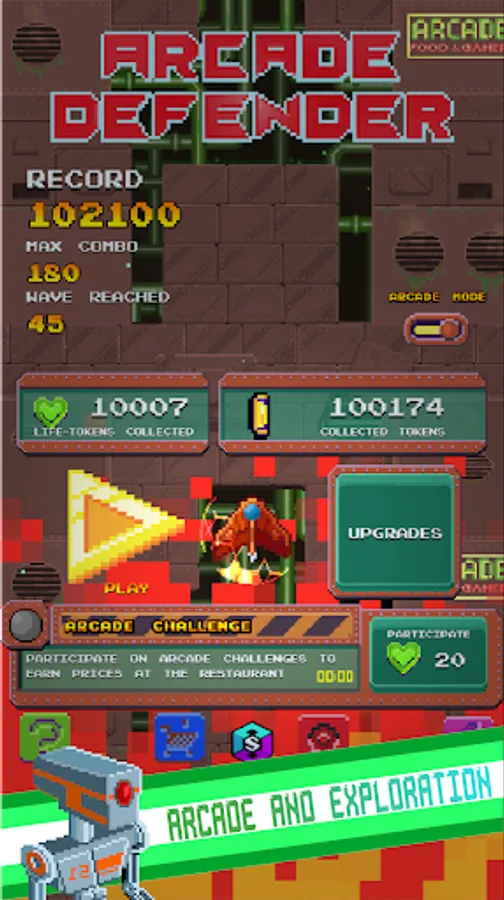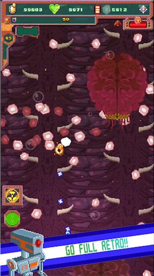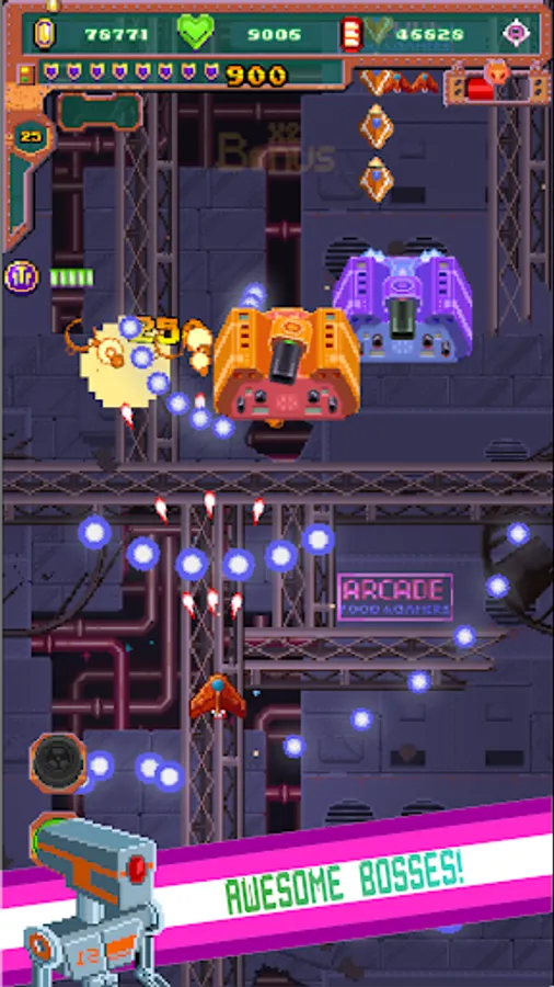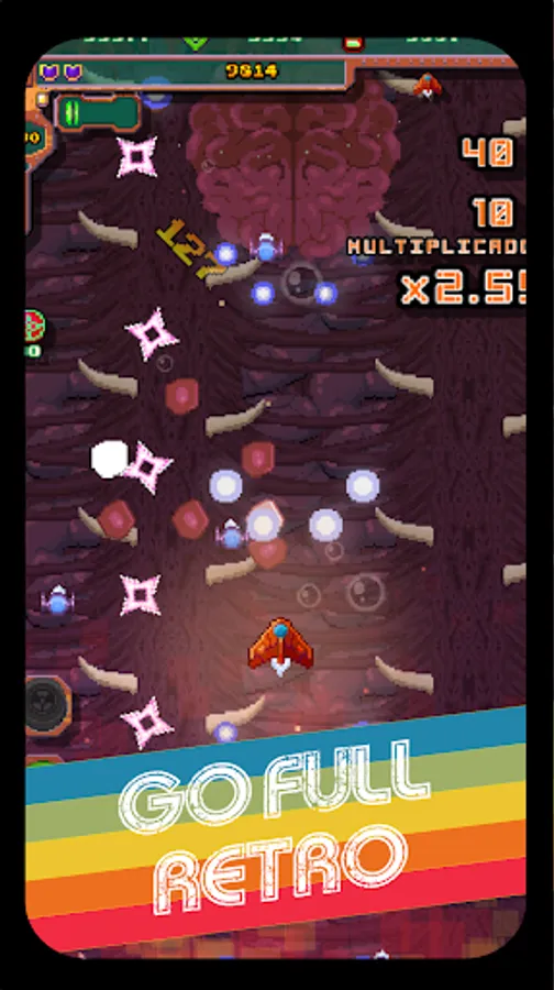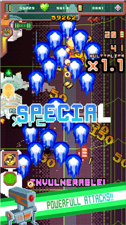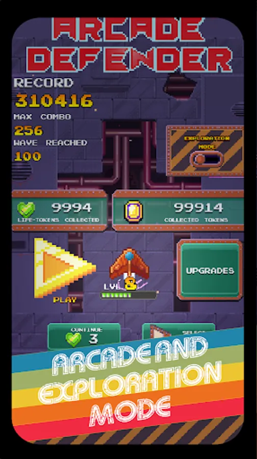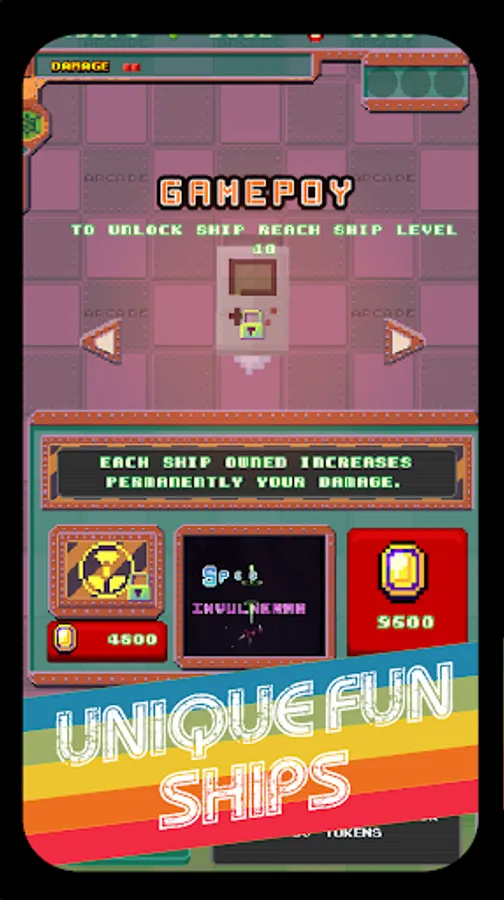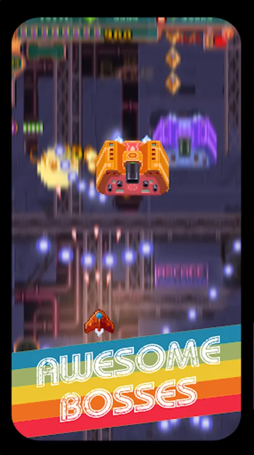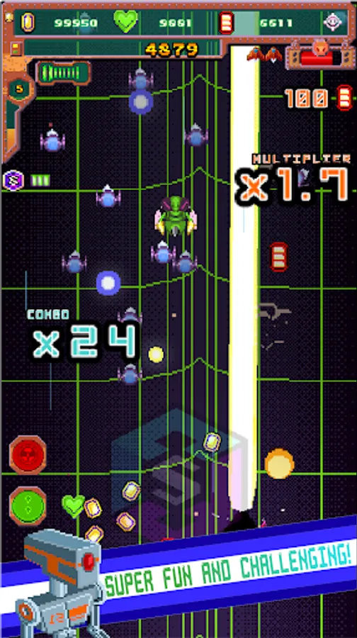 Destroy Arcade invaders and gather coins to upgrade your weapons. Have a coampletely retro feel with this pixelated shoot'em up. Just the toughest will be able to handle the 100 waves and beat the bosses.