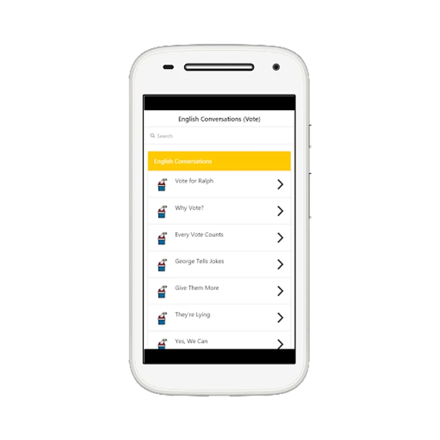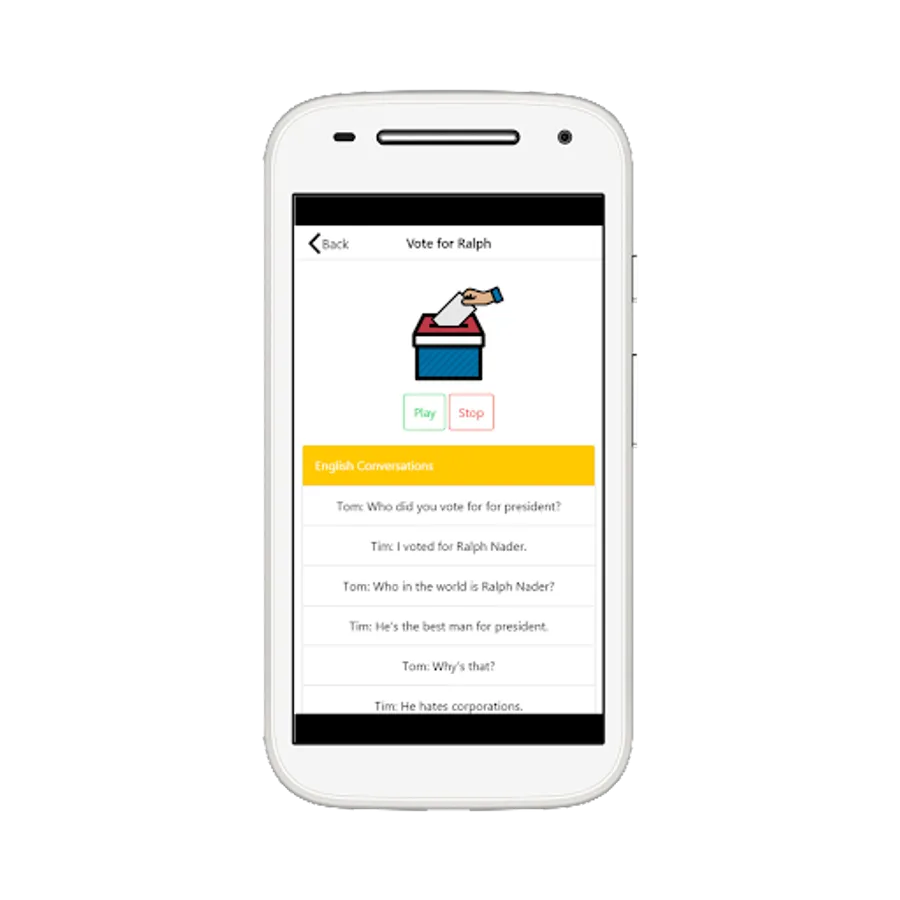 To be able to study English well. In addition to the basic vocabulary, the subject of dialogue. In English, it is very necessary and very important as well. English conversation app for votes. So gathering the dialogue on the subject of the election. Voting Going to the booth to cross. The election campaign in time. Voting in voting activities in the form of read and voice conversations. So we can pronounce and accent correctly. With its distinctive features, the app consists of generally using English phrases and vocabulary. It's easy to store and manage your favorite shows. The app is pretty simple and easy to use. Supports many languages, a lot of audio content. Learn vocabulary or phrases.