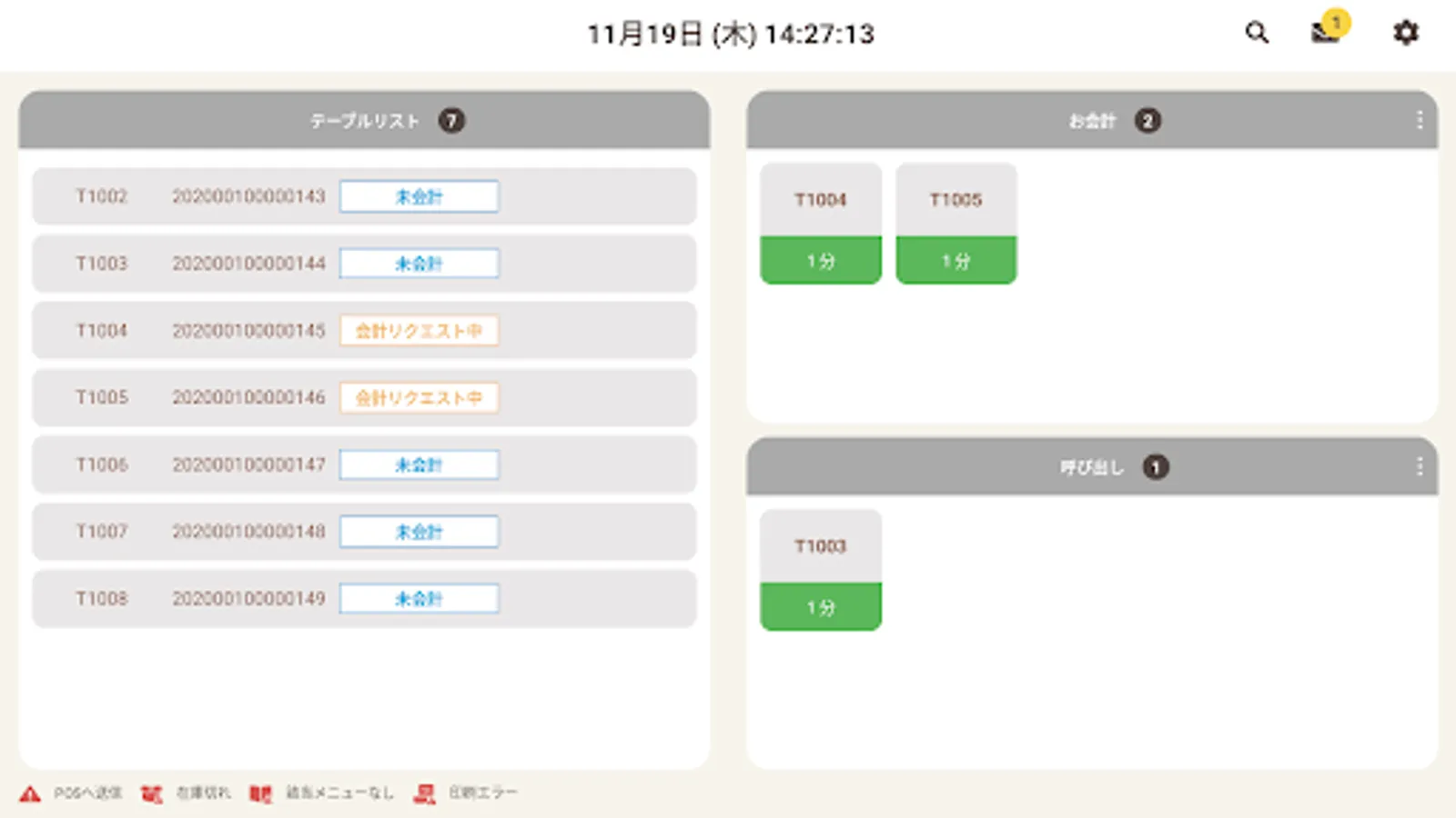 When a customer calls a clerk at POS + selforder, POS + OTS for selforder notifies you with a notification sound in real time, so you can check the target table at a glance.