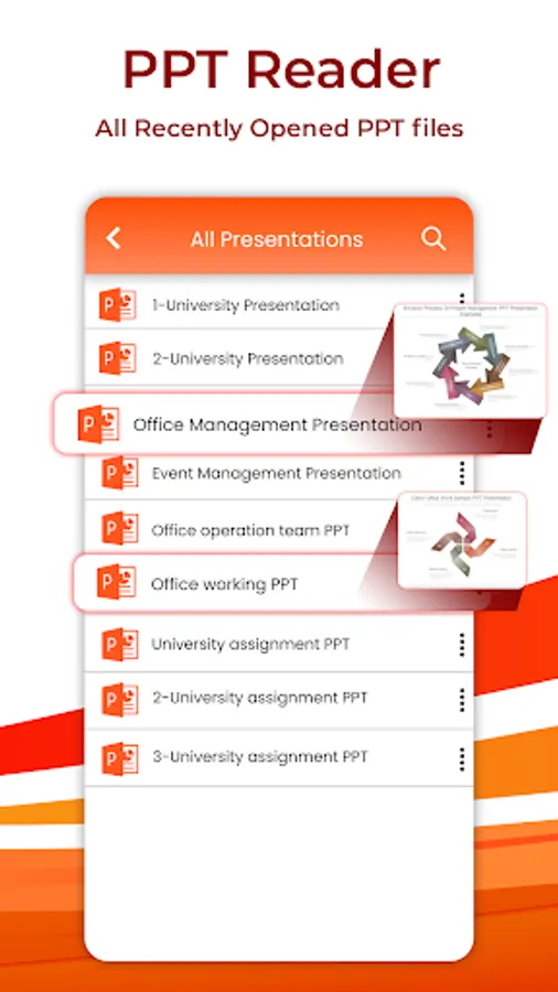 Need an opener by which you can open your all powerpoint slides? We bring professional presentation viewer, by which you can easily open and read your all ppt files quickly. You can also make some changes in your ppt documents via this file reader: ppt document reader app. PPT reader app for android provides you easy interface by which you can easily manage your ppt documents.