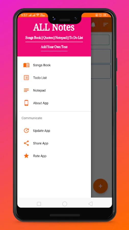 ALL Notes provides Songs Book, Notepad, To Do List and Quotes etc for FREE and helps you to take notes, create to-do list or task list or shopping list quickly and conveniently.