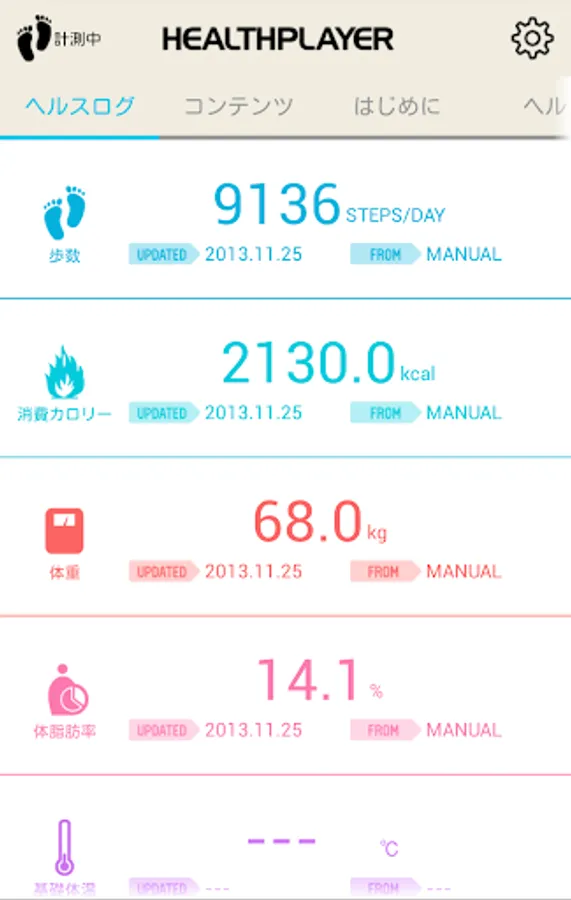 ・歩数/消費カロリー/体重/体脂肪率/基礎体温/生理日/血圧などのデータを記録できます