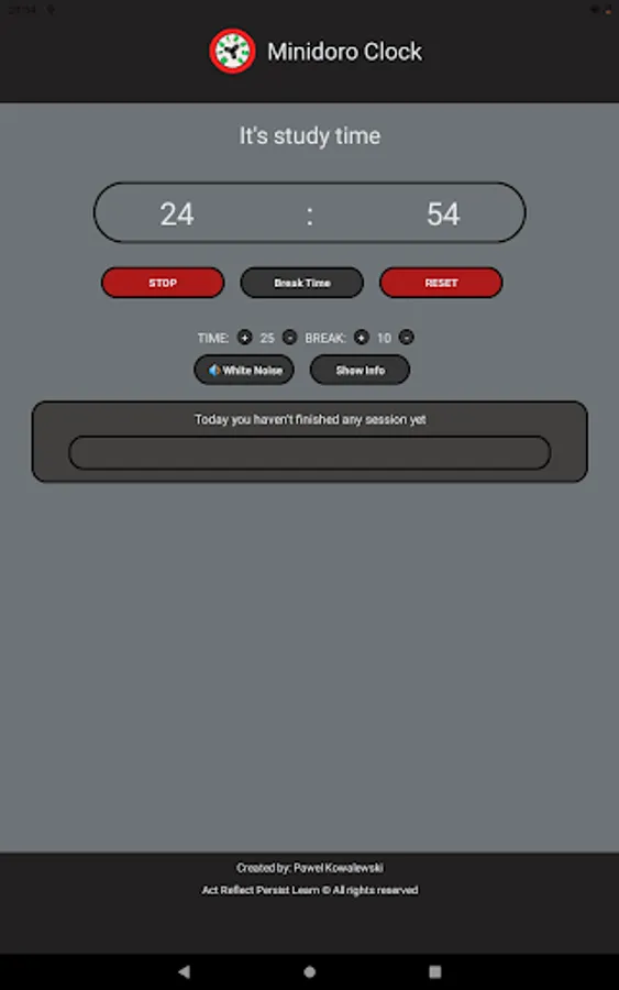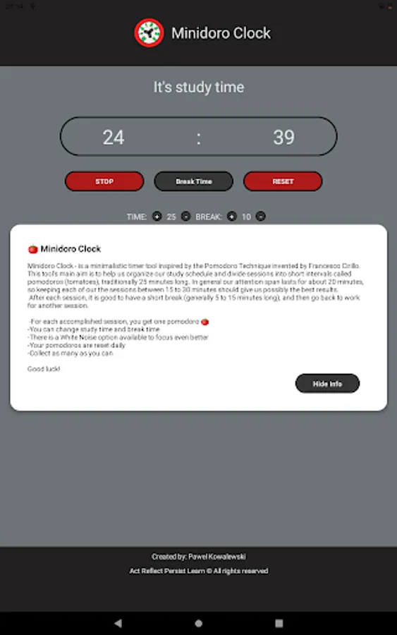 Minidoro Clock - is a minimalistic timer tool inspired by the Pomodoro Technique invented by Francesco Cirillo. This tool's main aim is to help us organize our study schedule and divide sessions into short intervals called pomodoros (tomatoes), traditionally 25 minutes long.