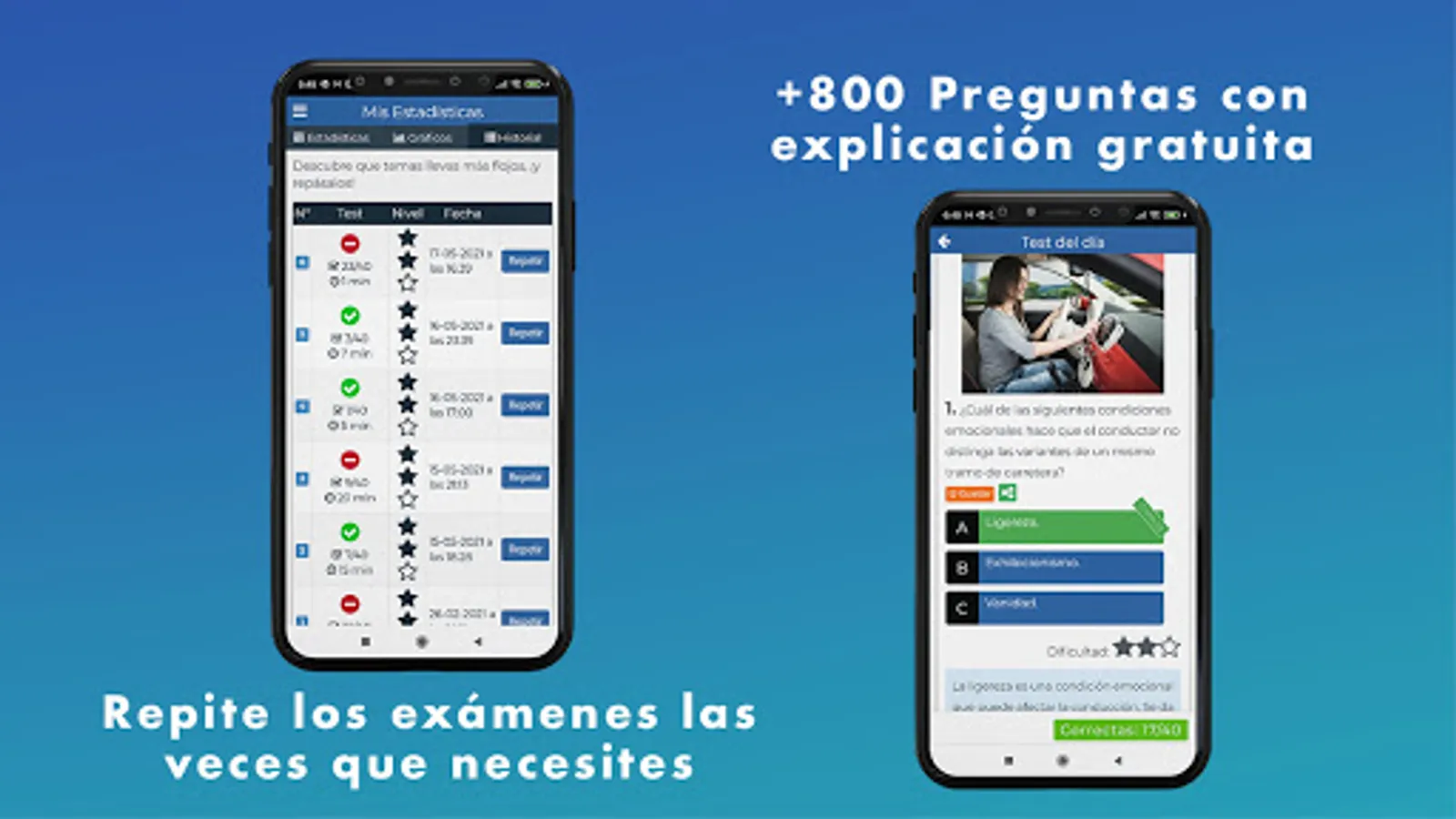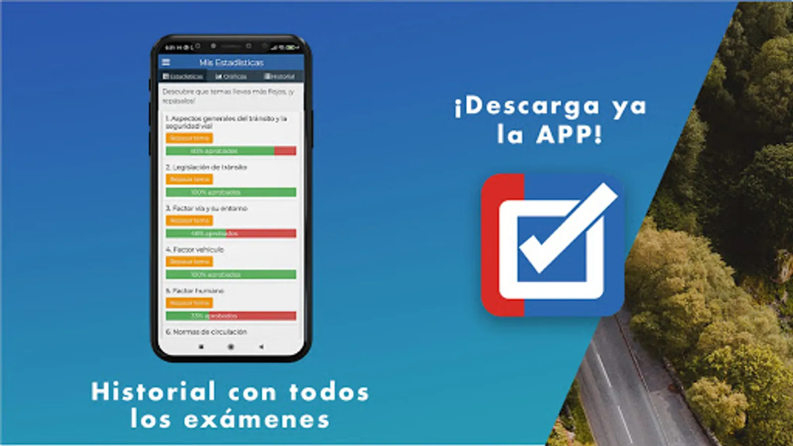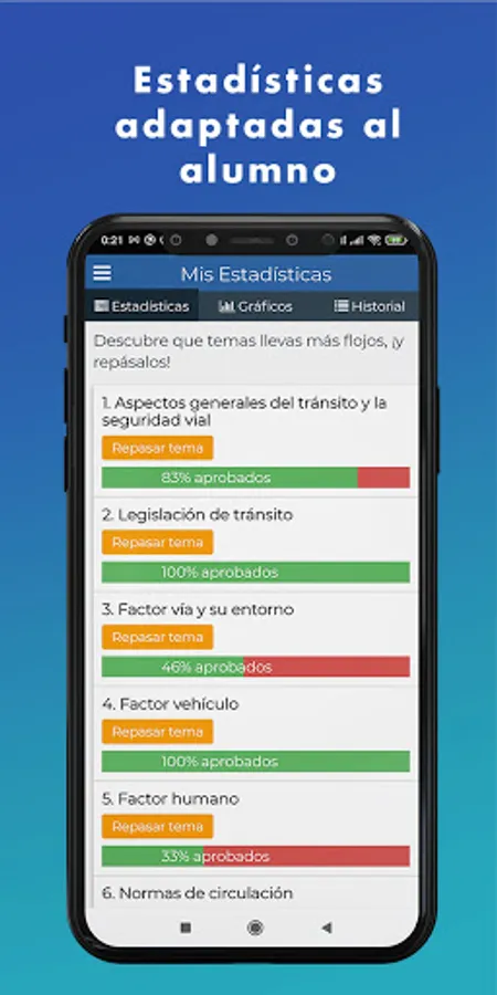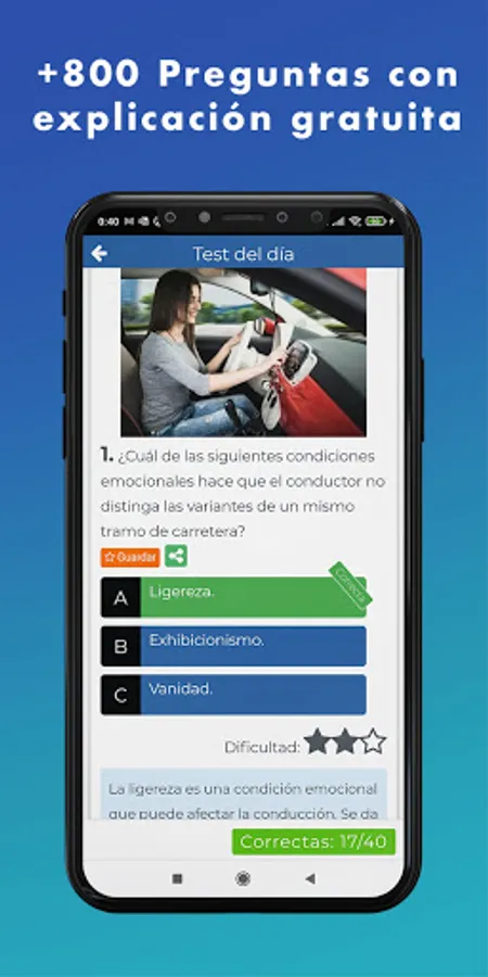 Our app gives you the opportunity to know your progress at all times to find out whether or not you are ready to take the Cosevi theory test.