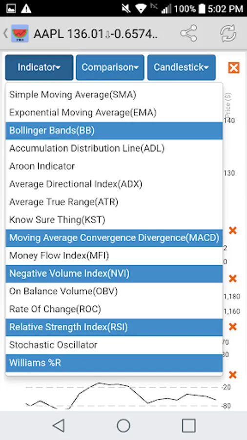 - Top-notch interactive stock charts with powerful and well-known indicators for technical analysis, including SMA, EMA, Bollinger Bands, ADL, Aroon Indicator, Average Directional Index (ADX), Average True Range (ATR), Know Sure Thing (KST), MACD, Money Flow Index (MFI), Negative Volume Index (NVI), On Balance Volume (OBV), ROC, RSI, Stochastic Oscillator, Williams %R and more.