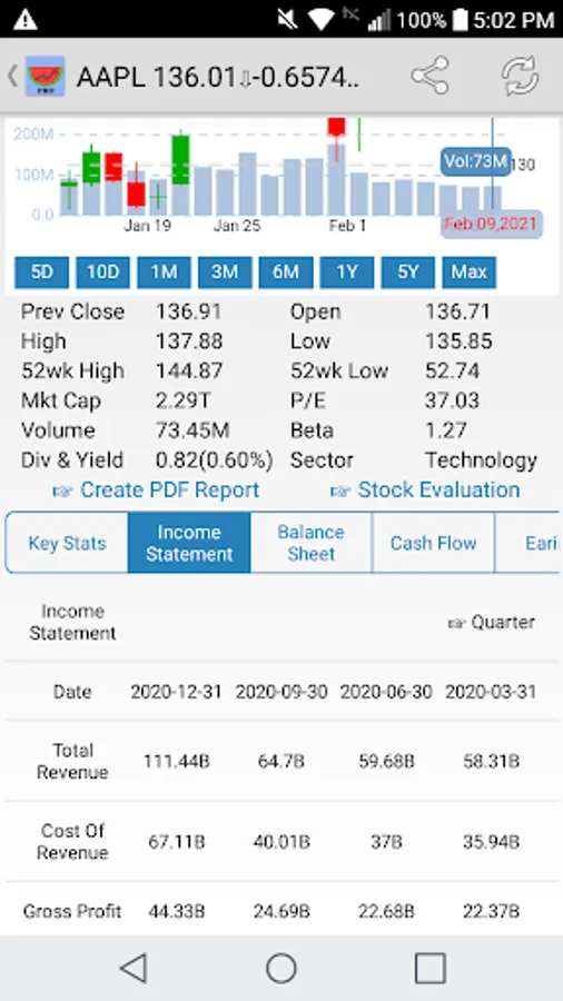 - Generate Unlimited PDF Reports: Create informative and comprehensive PDF reports that include financials (income statement, balance sheet, cash flow), earnings data, and key statistics. These reports offer in-depth insights and facilitate thorough analysis.