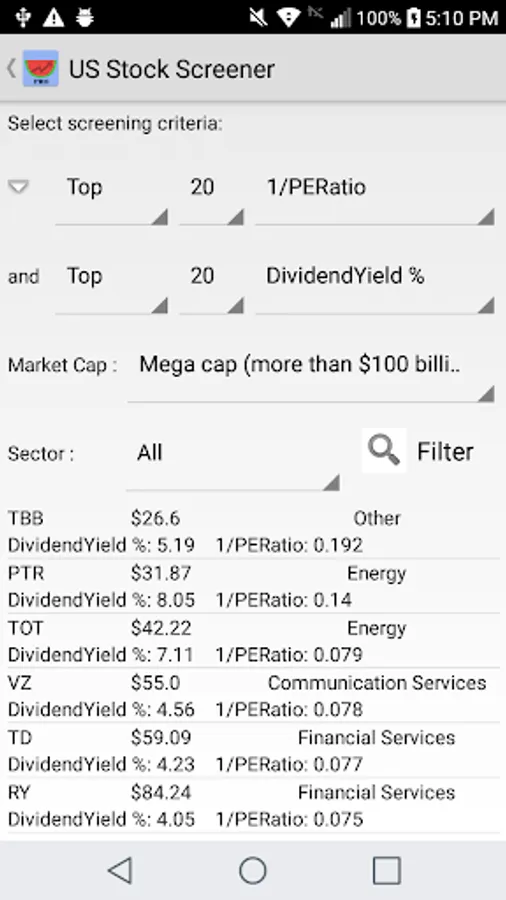 - Stock Screener: Utilize the stock screener feature to retrieve matching US stocks based on specific screening criteria. Select from 12 key statistics (such as 1/PERatio, DividendYield, and ProfitMargin) and choose different Market Cap or Sector options. Further refine the search by adding additional key statistics. The screening results can be exported in CSV format for easy sharing.