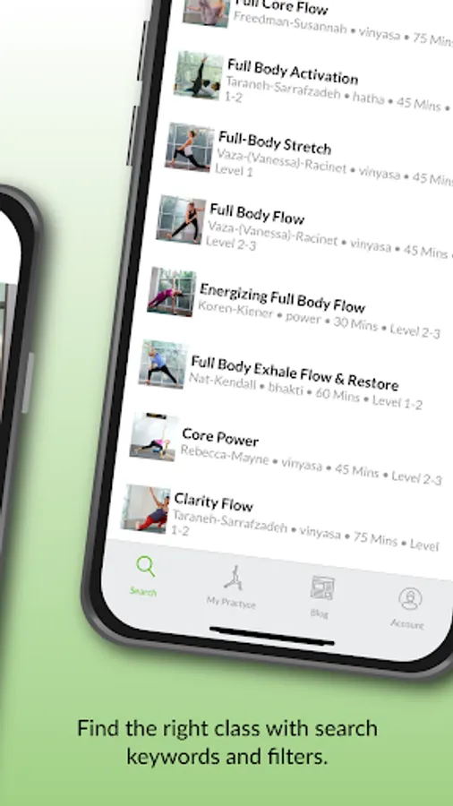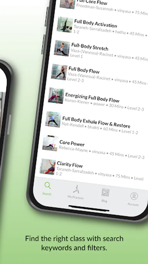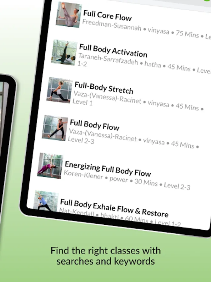 Click on search and find classes to fit your mood with keywords such as "meditation," "power," "stress," and "beginner," along with the filters to find exactly what you need by level, style, teacher, body part, duration, and more.