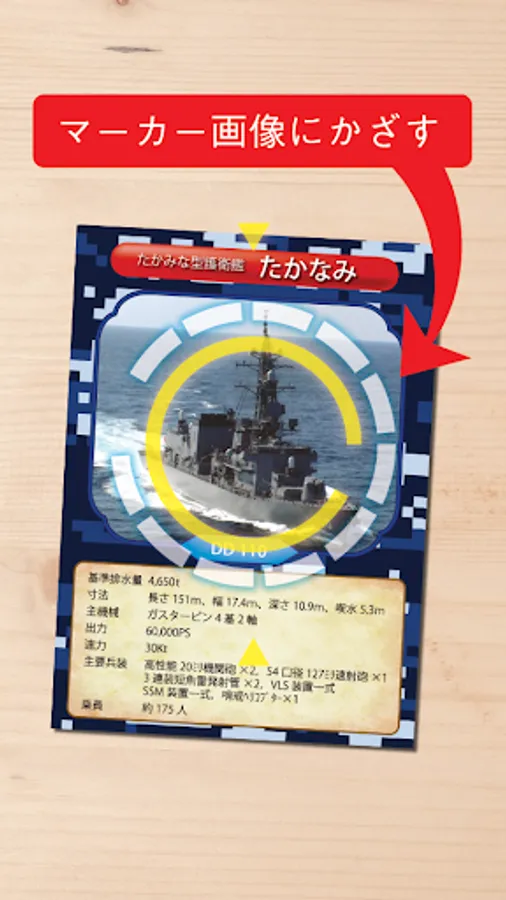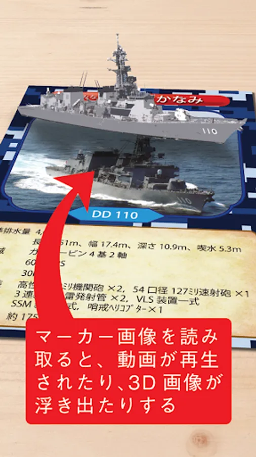 -Hold the smartphone running this app over the surface of the Maritime Self-Defense Force card to display multiple photos of ships and aircraft. (40 types in total)