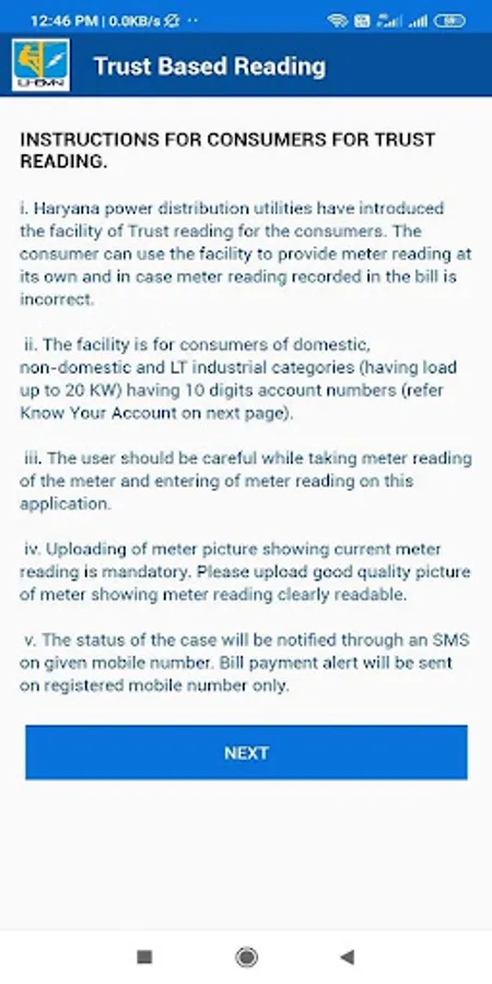 Haryana trust reading application has been developed by Haryana Power Distribution Utility i.e. UHBVN to connect with its consumers for trust based reading. The application is aimed at extending flexibility to the consumers for self filling of meter reading in case any consumer observes that the meter reading in the issued bill is incorrect or provisional bill has been issued without meter reading.